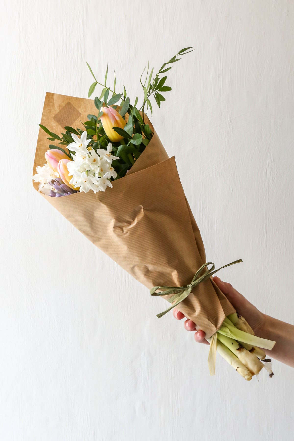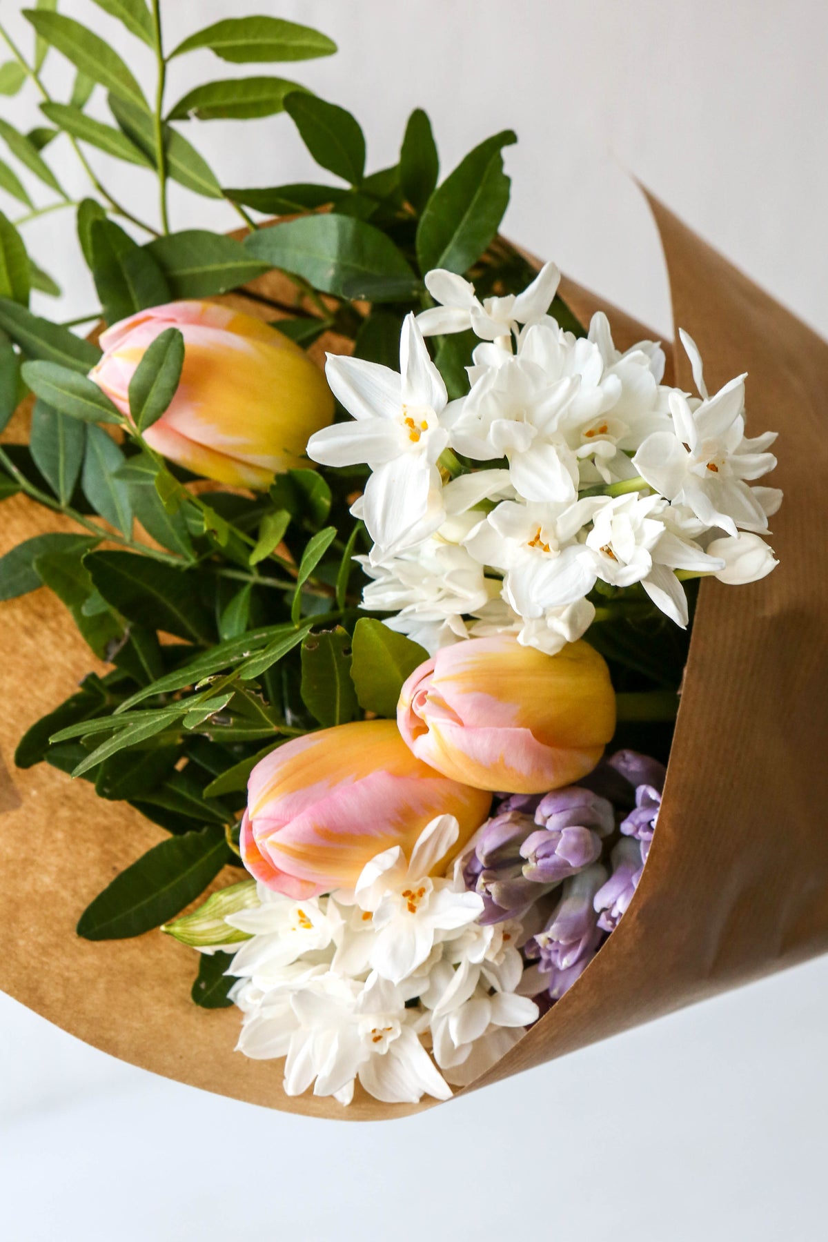 A bouquet containing hyacinths, tulips and narcisus. Beautifully scented and perfect for Mother's Day.
