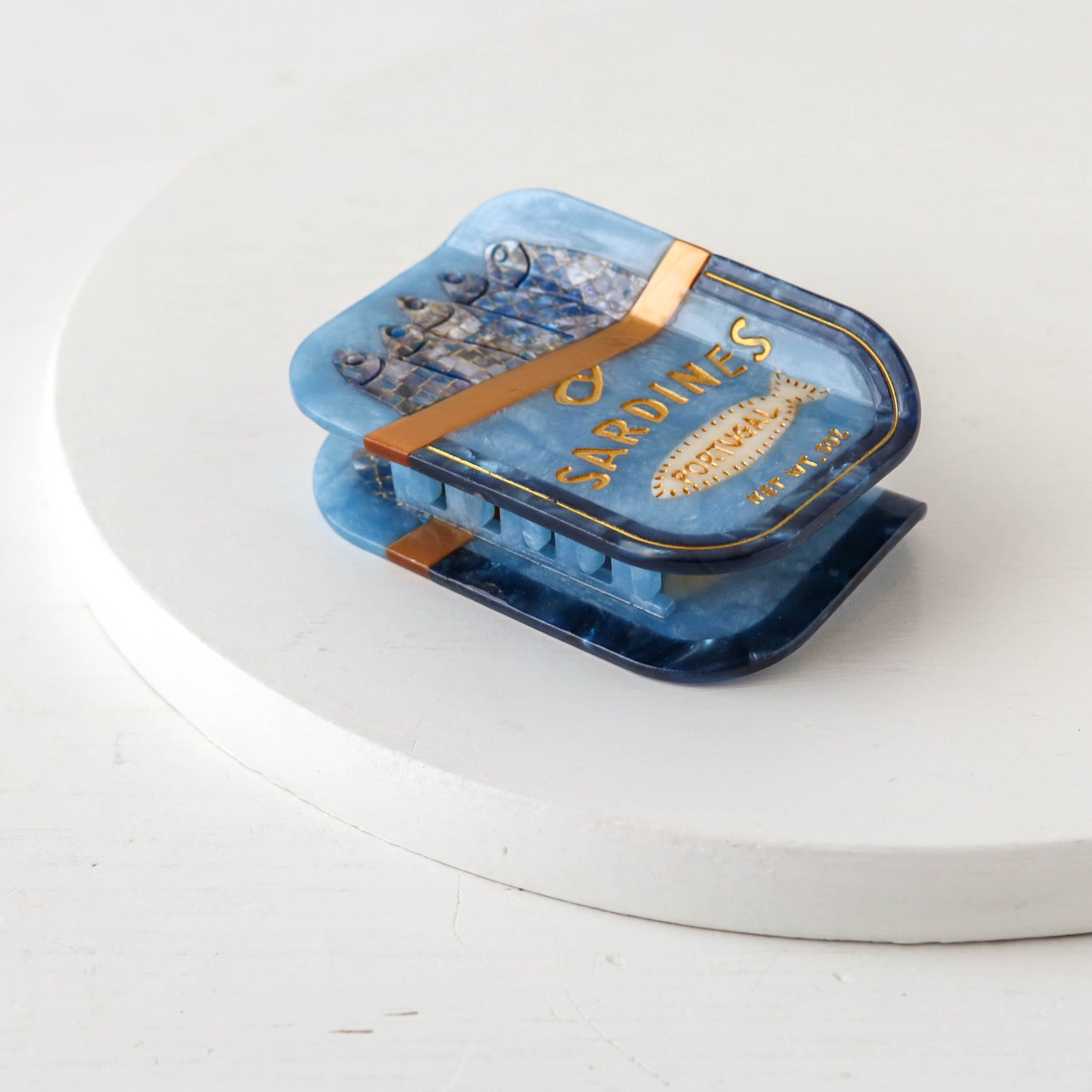 Cellulose hair claw, shaped like a can of sardines! Hand painted details.