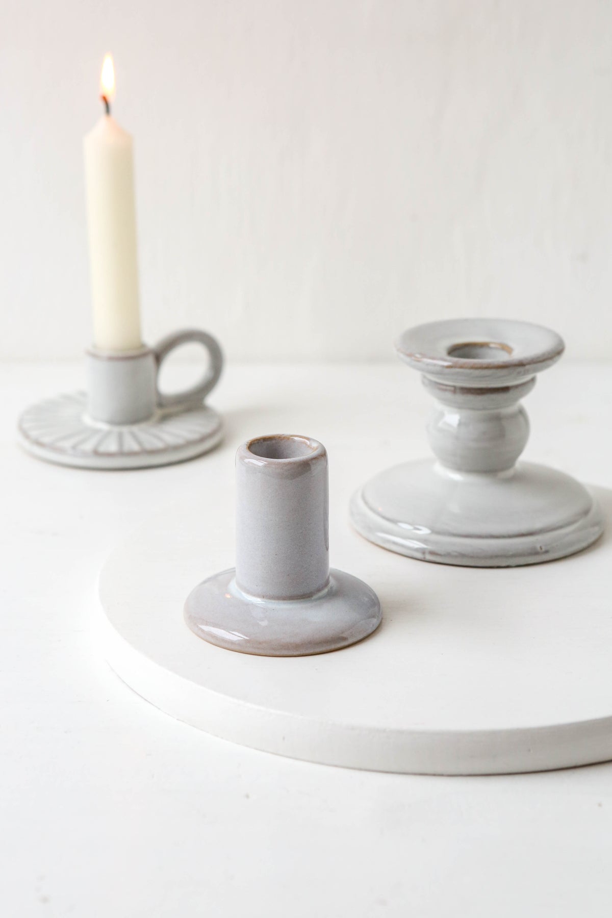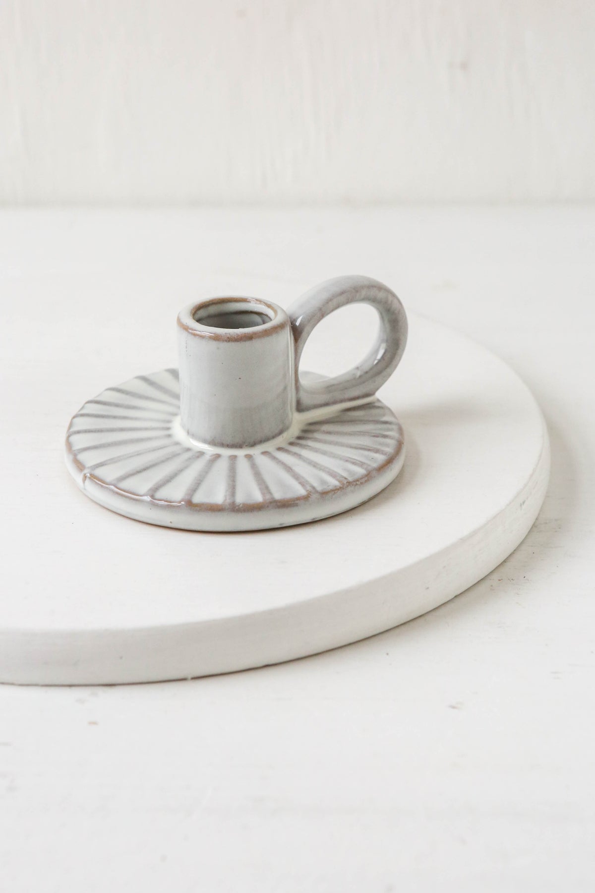 Off-white, stoneware dinner candle holder. Understated, rustic finish with an elegant handle; a stable base for your favourite candle, whether on your mantelpiece dinner table.