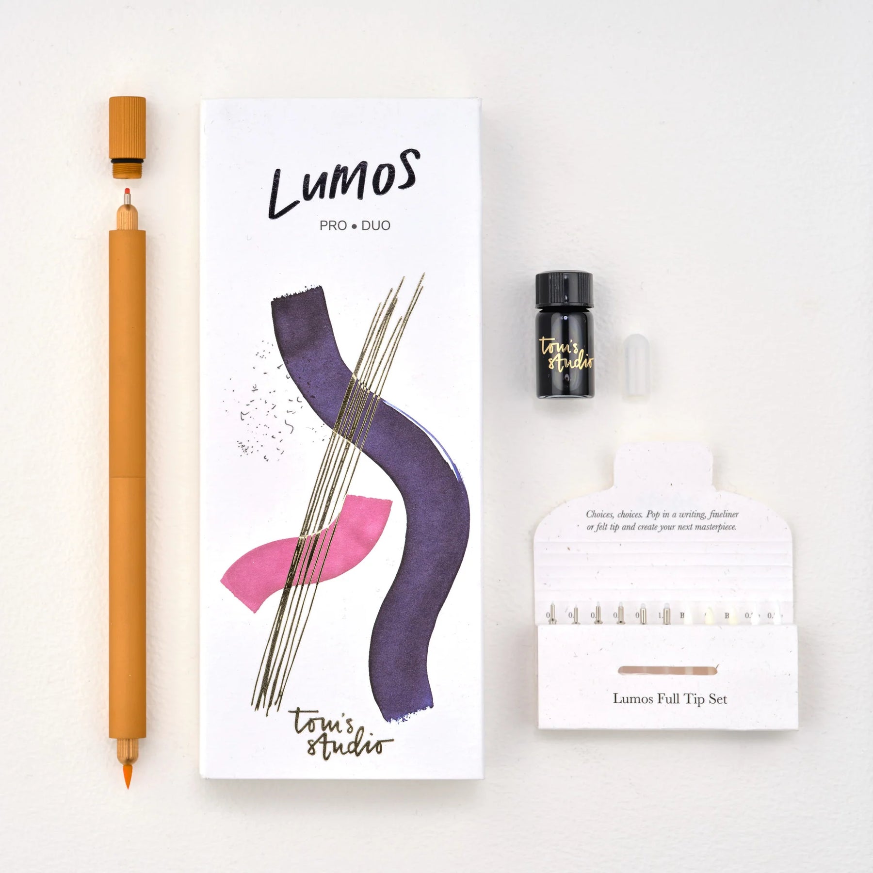The Lumos Pro Duo is a beautiful and infinitely refillable fineliner, writing, and brush pen, including 9 professional artist's tips and 2 writing tips, all in a compact, pocket-friendly package.