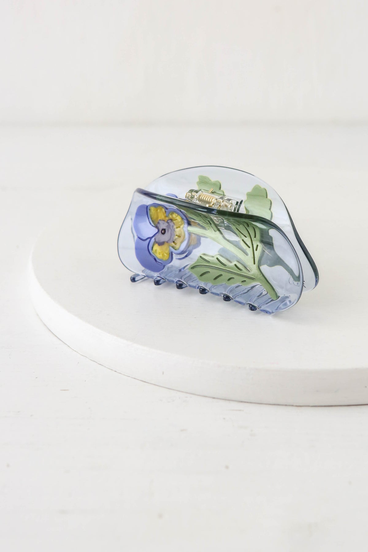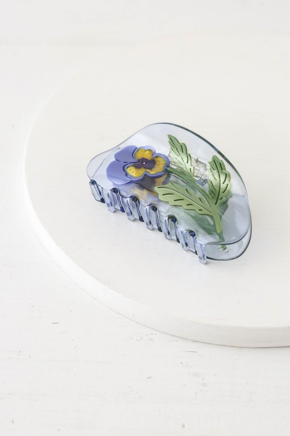 An intricate Viola inlaid into the palest blue acetate. Featuring deep purples and shimmering yellows, this delicate blossom is a florists delight! A bouquet of flowers from an eternally blooming garden.