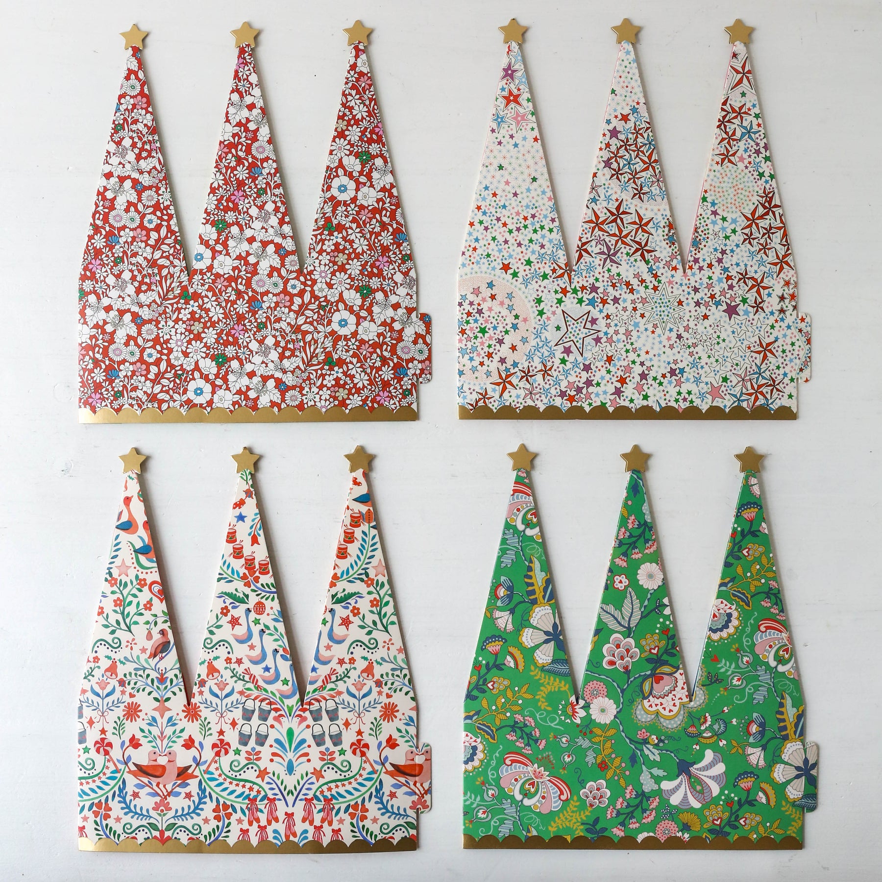 Let these majestic party crowns instantly elevate your festive style. Made from premium paper, with joyful Liberty prints, paired with bold stripes on the inside, for a striking contrast. Pale matt gold foil stars and a scalloped border add an extra layer of refinement. Designed with adjustable tabs for a comfortable fit, they're perfect for playful charm for the whole family. When the parties are over, simply pack them away to reuse year after year.