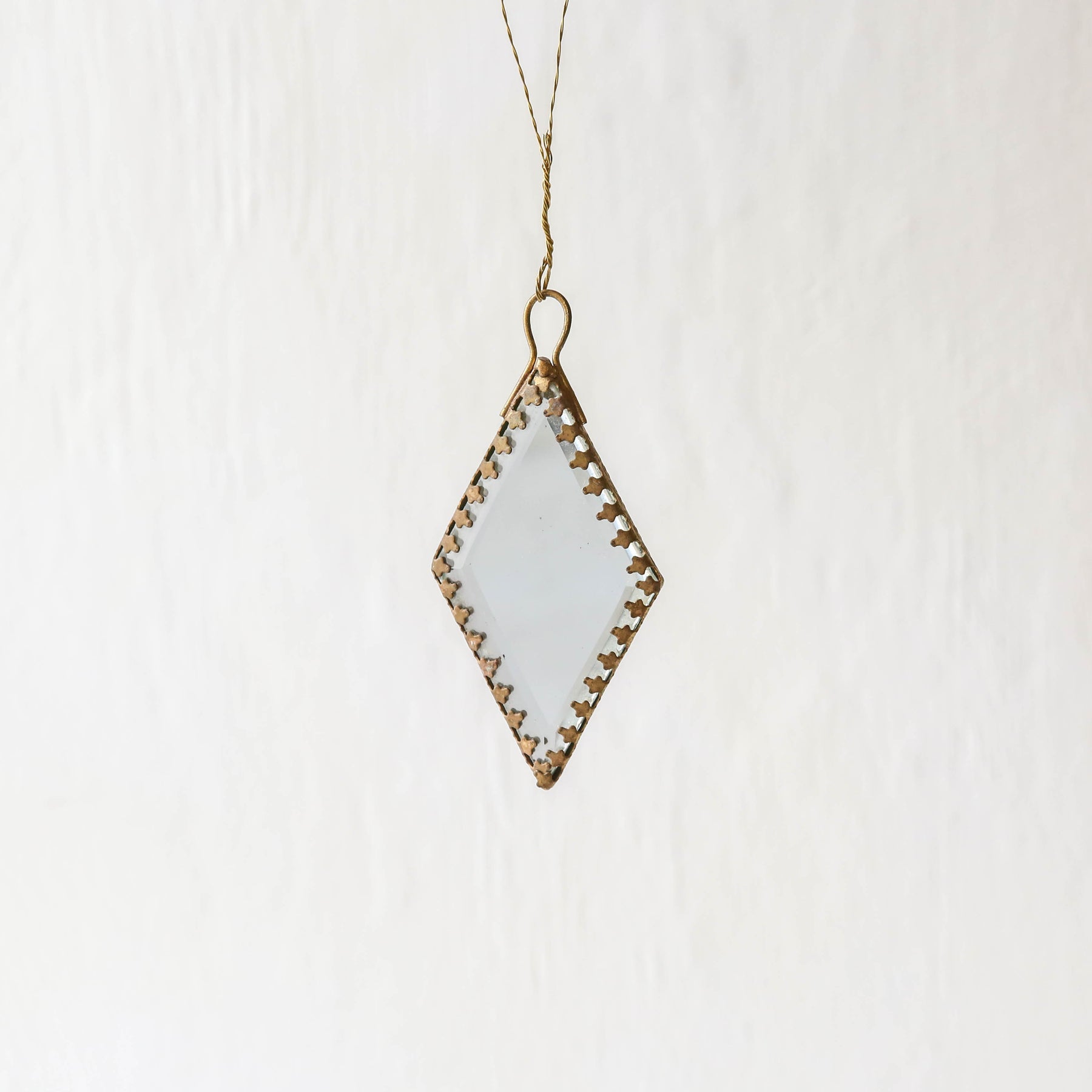 A small, faceted mirror that is perfect for hanging. The mirror has a black backing.