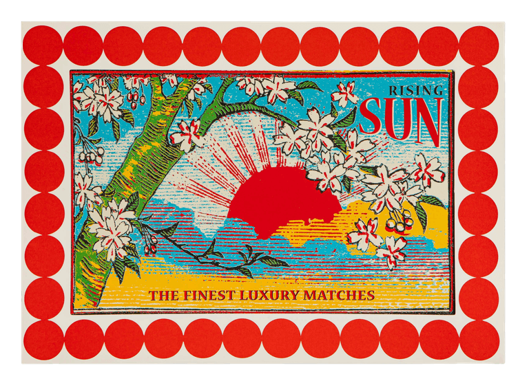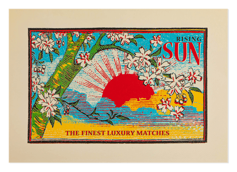 Spot colour medium print featuring a blossom tree in front of a sunrise over the mountains with the words 'Rising Sun, The Finest Luxury Matches.' Inspired by a Japanese matchbox label.
