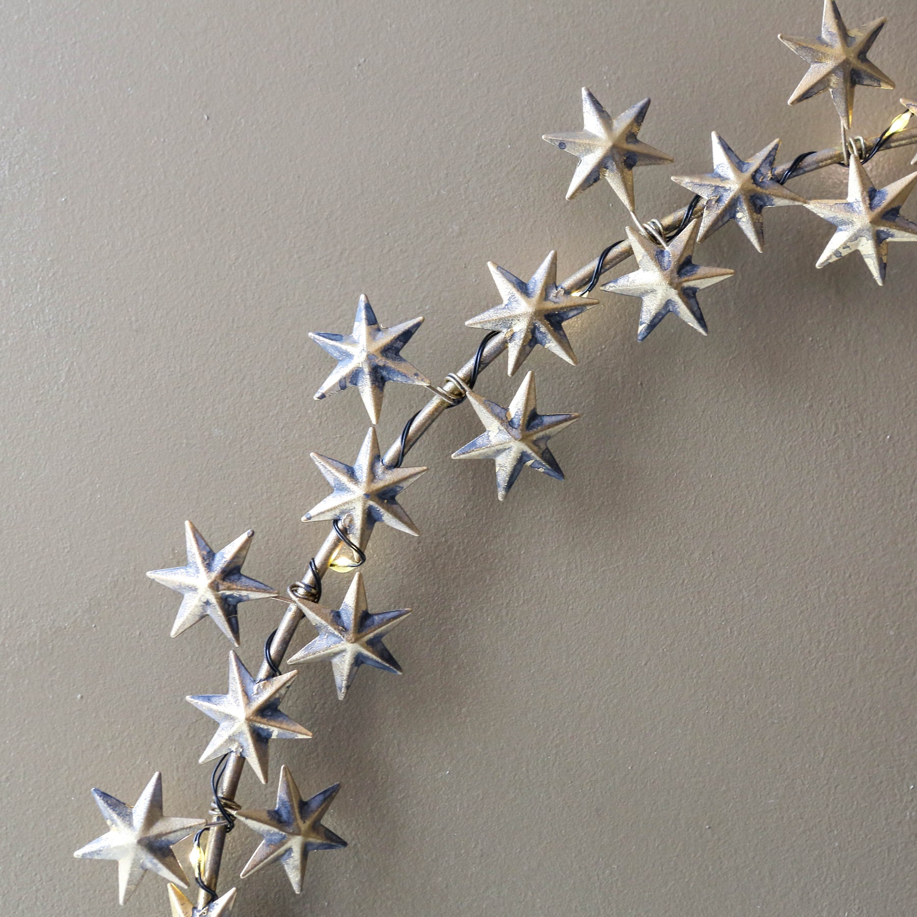A pretty lit-up metal star wreath, in gold tone, rustic finish pressed metal. The wreath is lit with 18 warm white LEDs, which run on batteries so you can place it anywhere!
