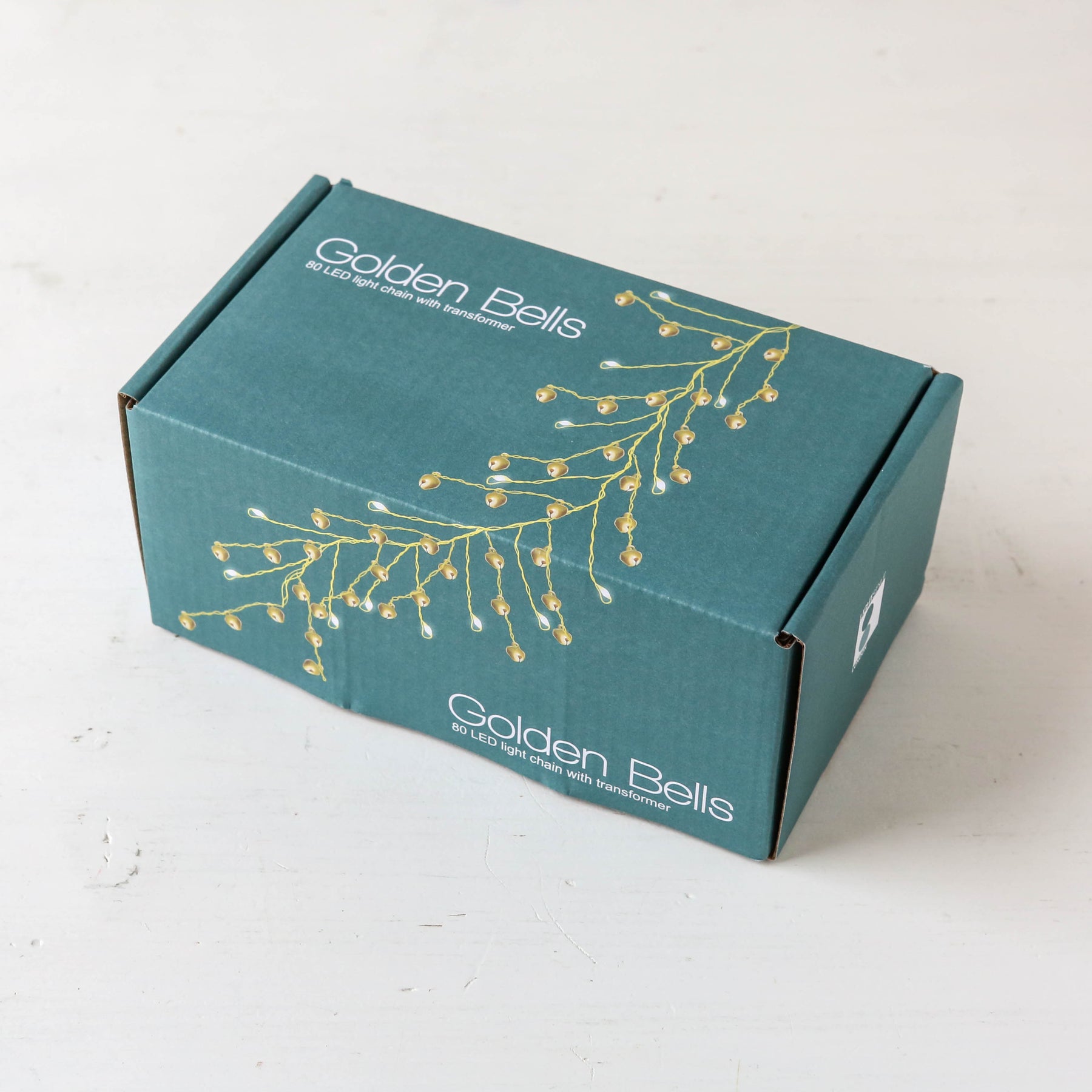 Golden bells, clustered onto a wire garland and illuminated with 80 warm LED lights. Magical!