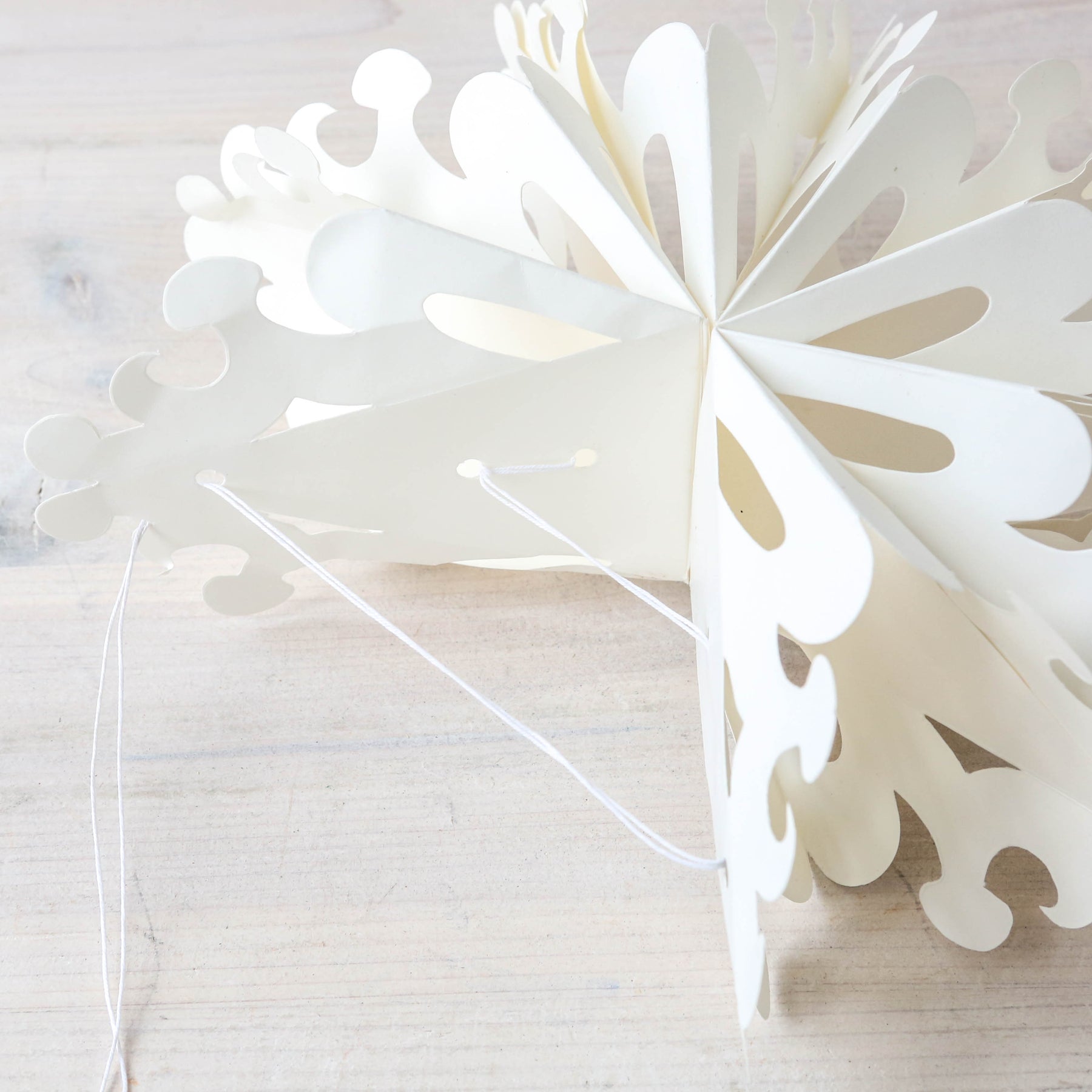 This stunning snowflake paper decoration, is machine cut, and made from a heavy duty white paper, before being assembled by hand.