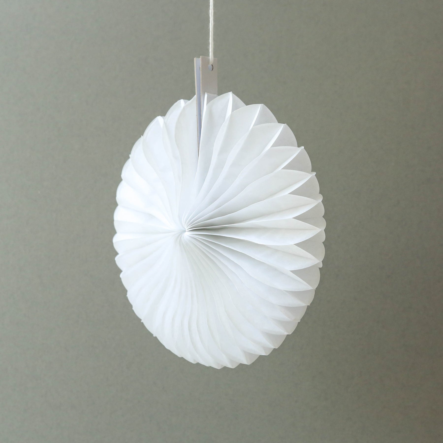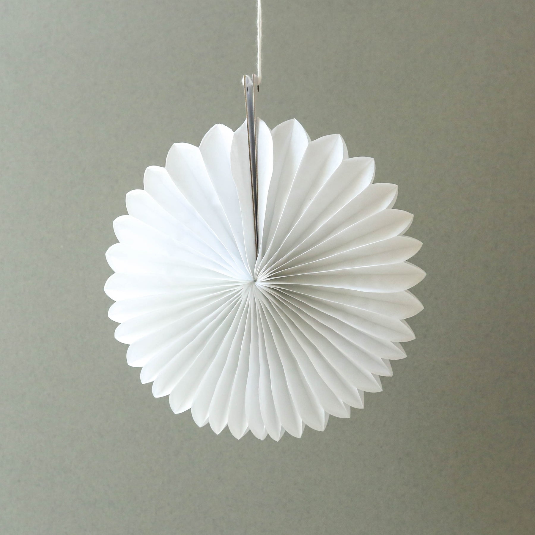 Lovely paper fan ornament. Just open up the ornament and tie together before hanging.
