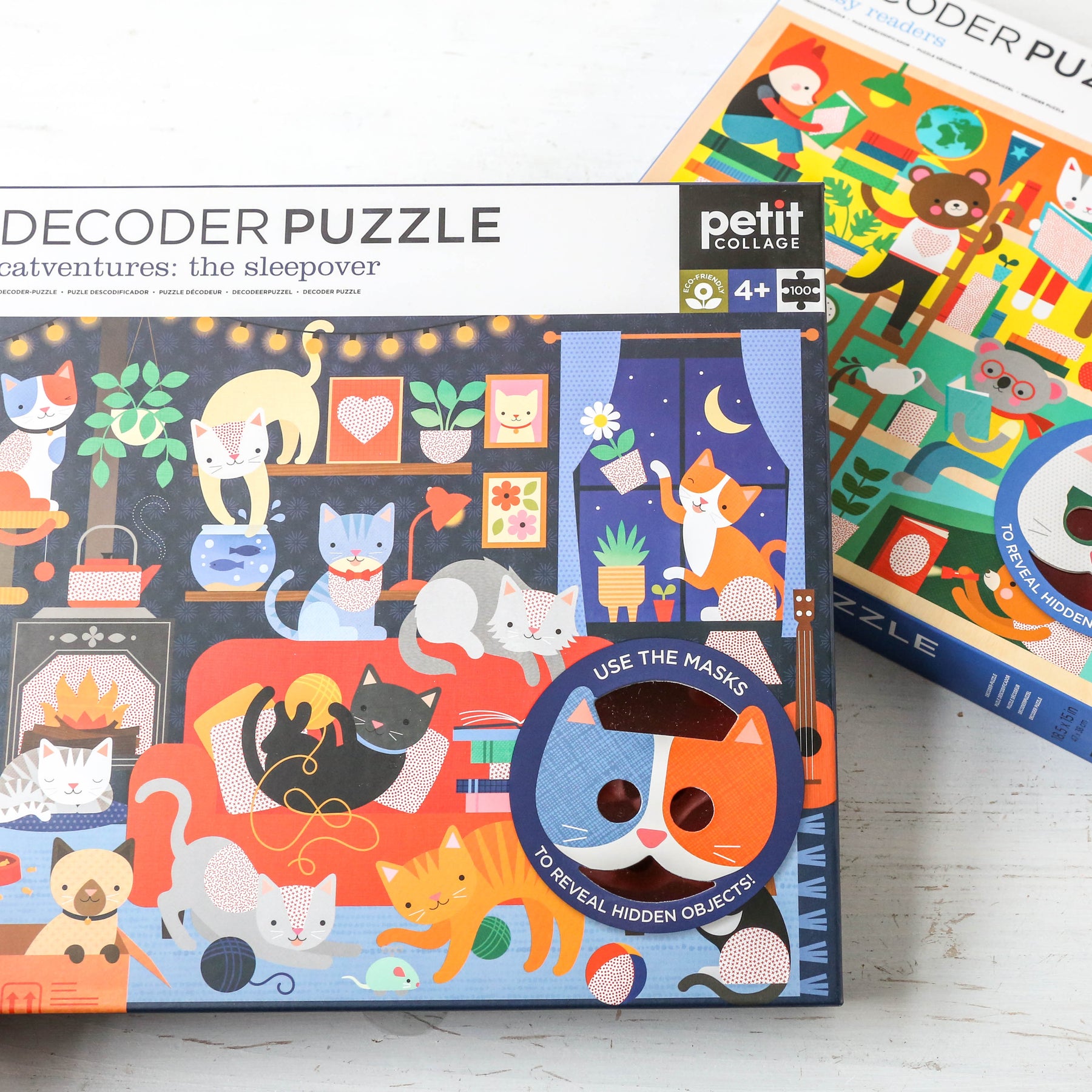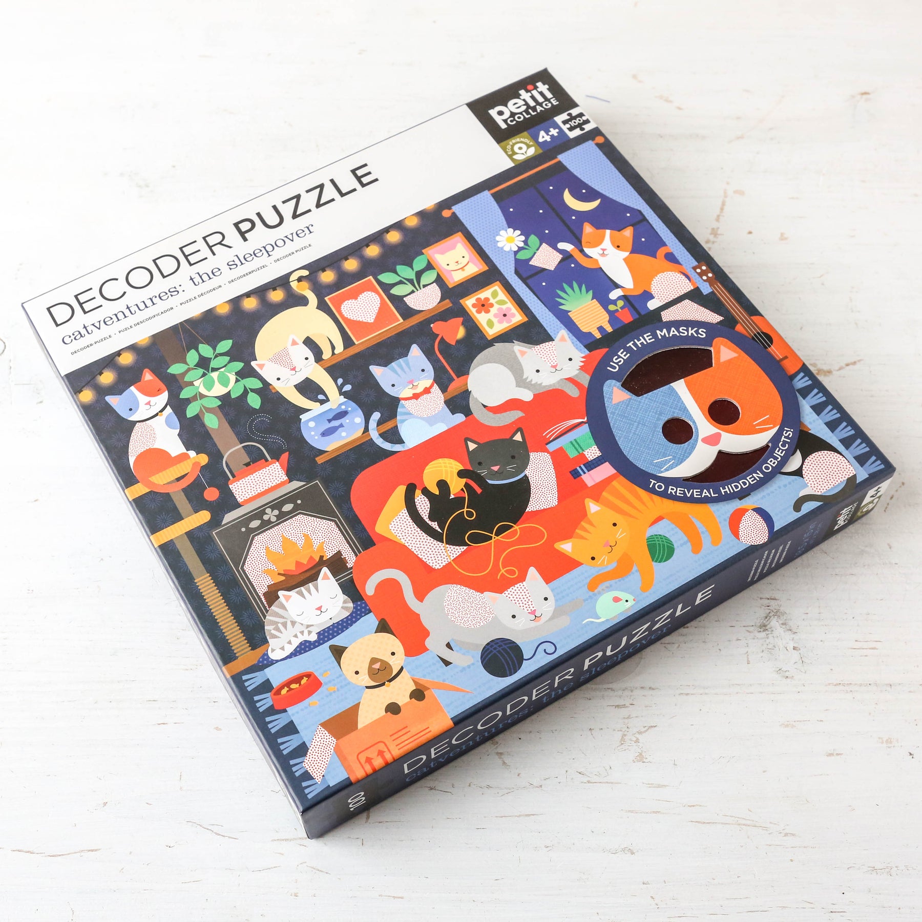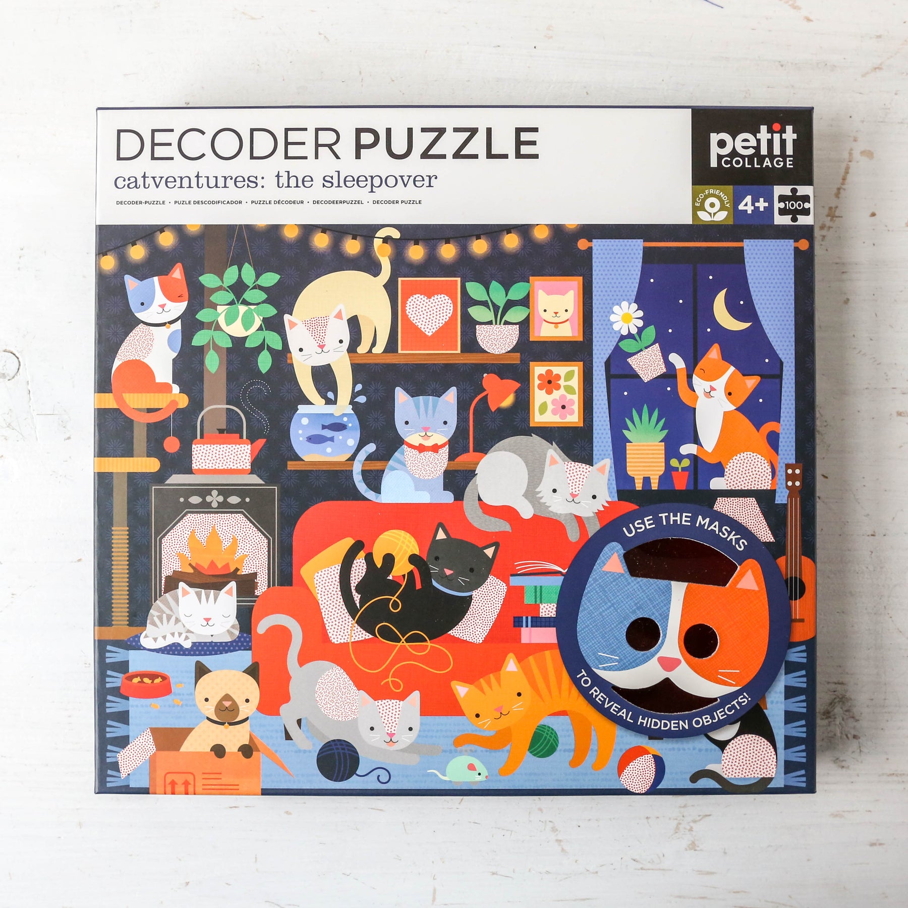 Meow! These furry friends are ready for an all-night paw-some party. But can you find what's hiding in this busy room? Complete the puzzle and use the decoder masks to find the hidden objects in this Catventures – The Sleepover 100-piece Decoder Puzzle from Petit Collage.