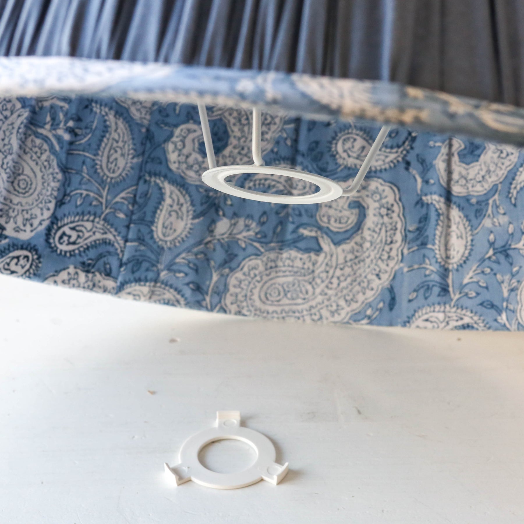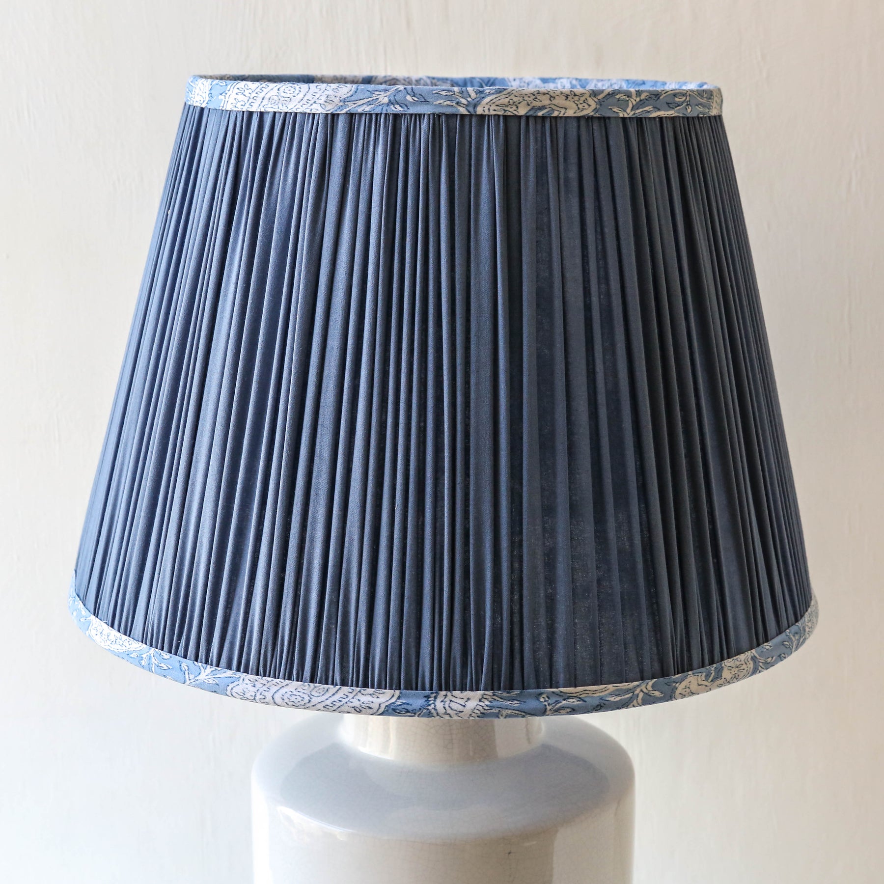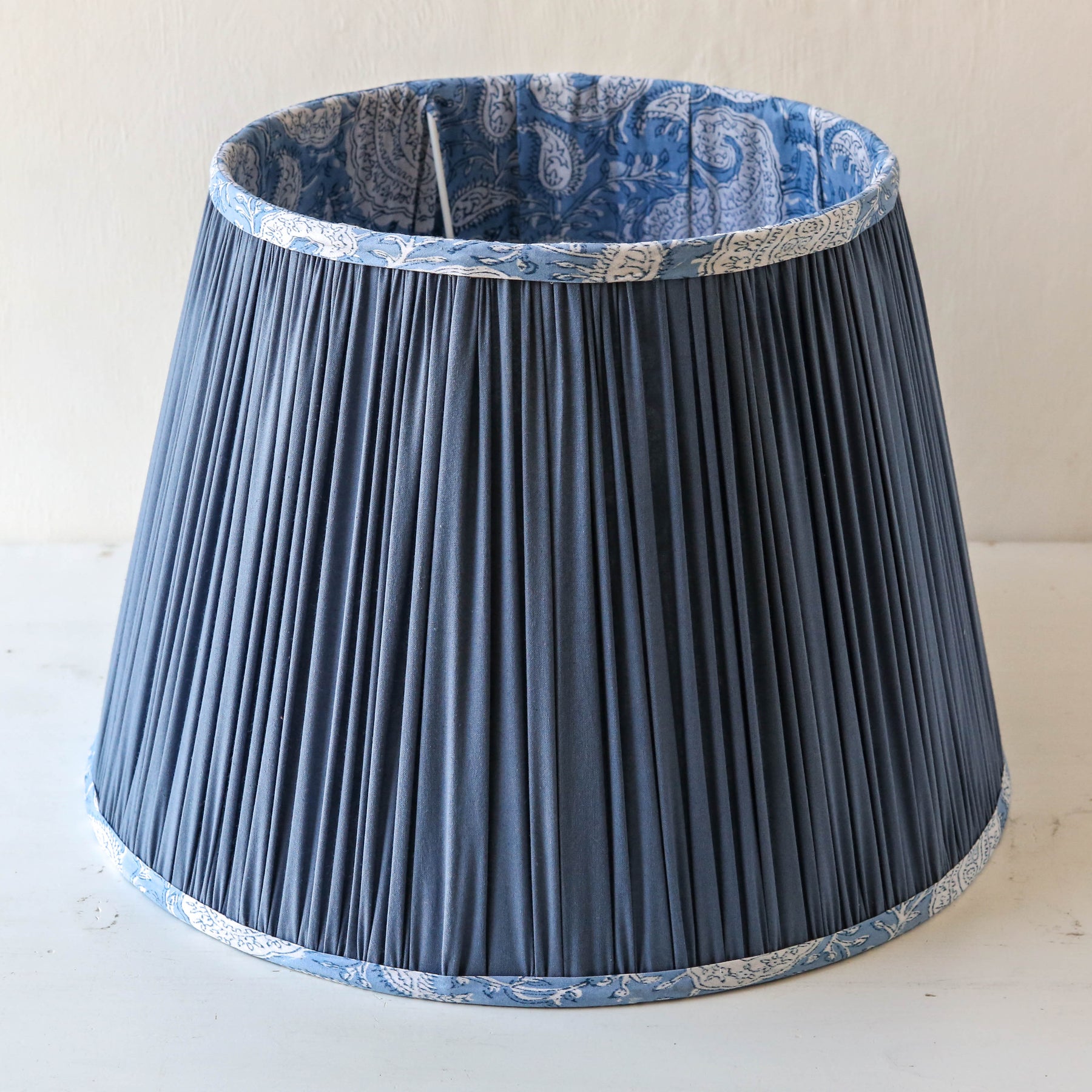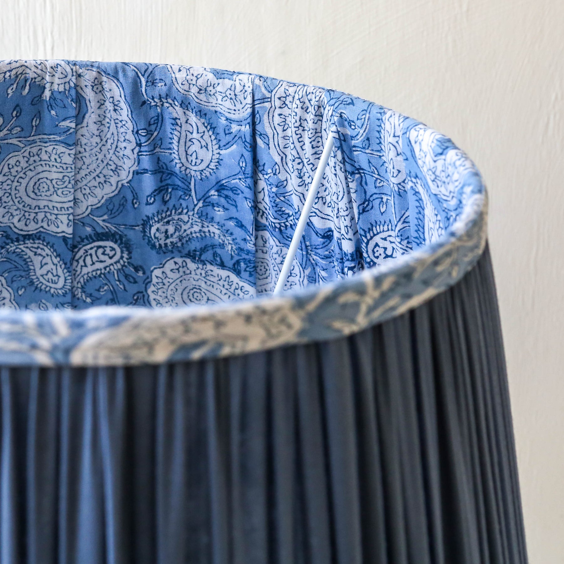 Cotton lampshade in a pretty cornflower shade, lined with a co-ordinating block printed pattern.
