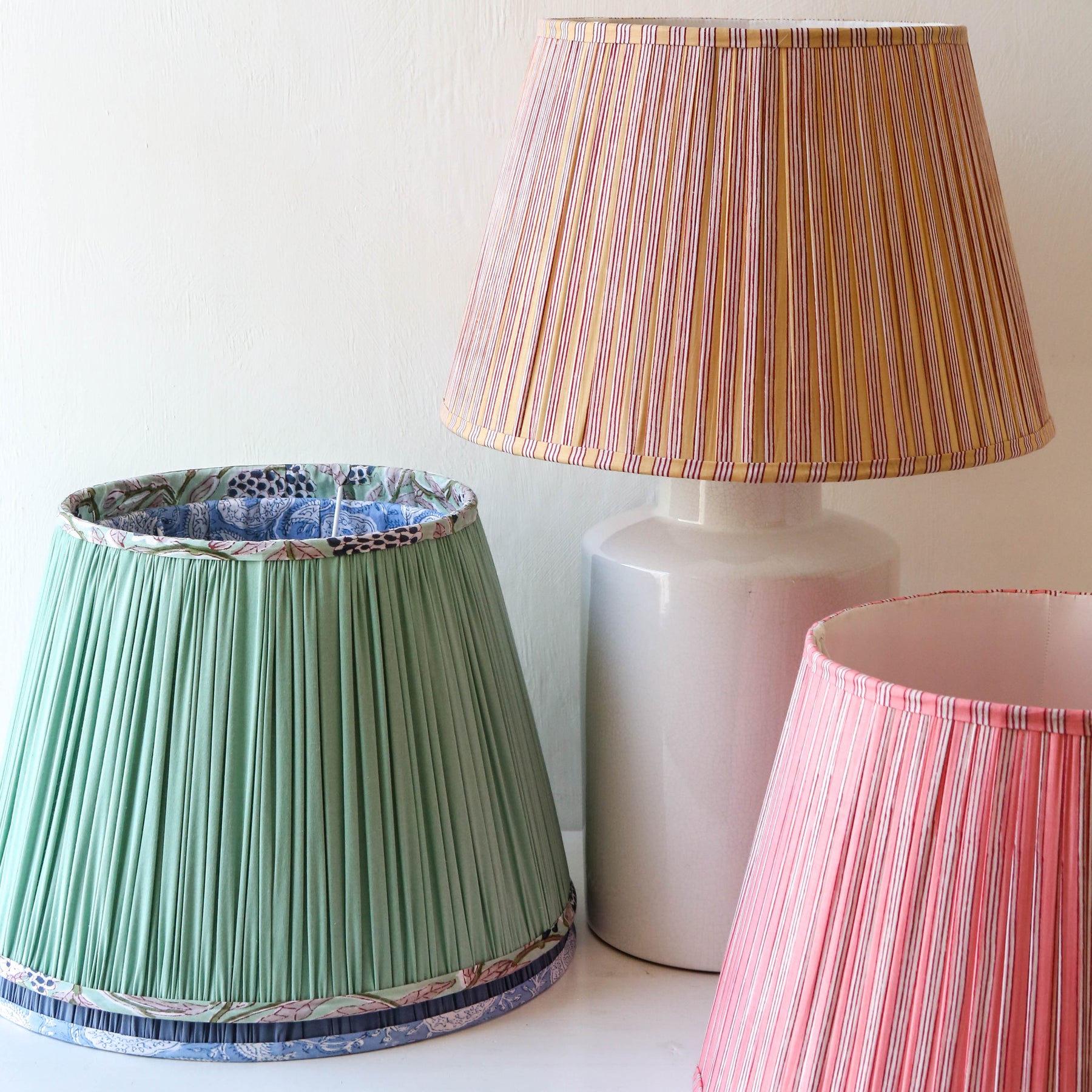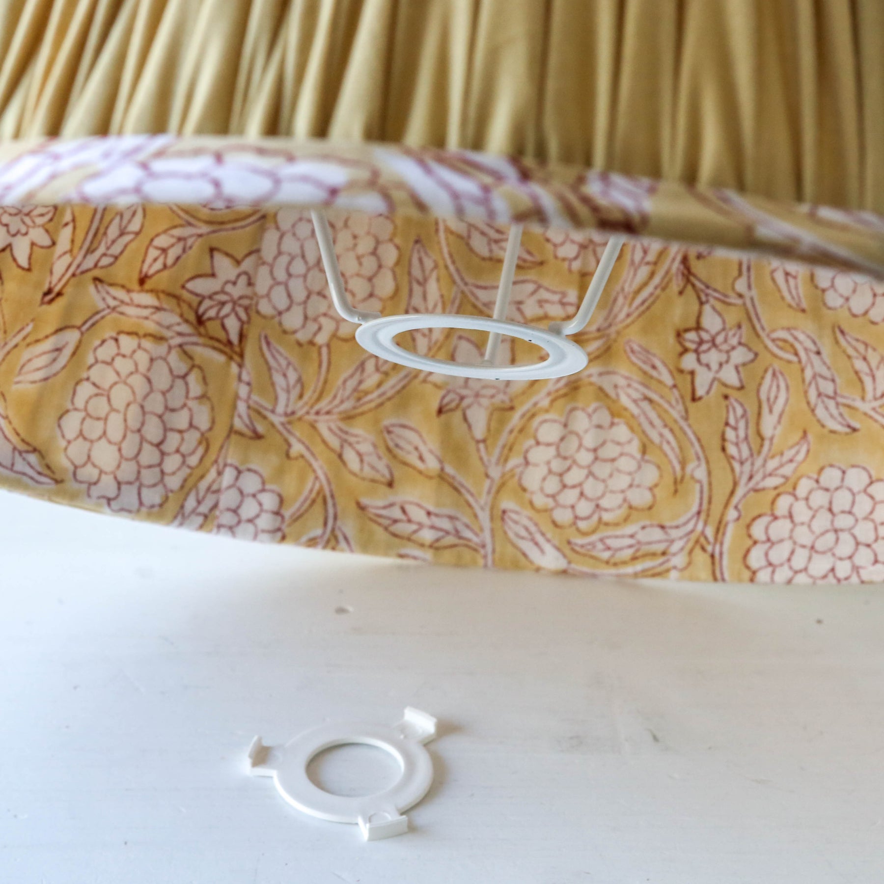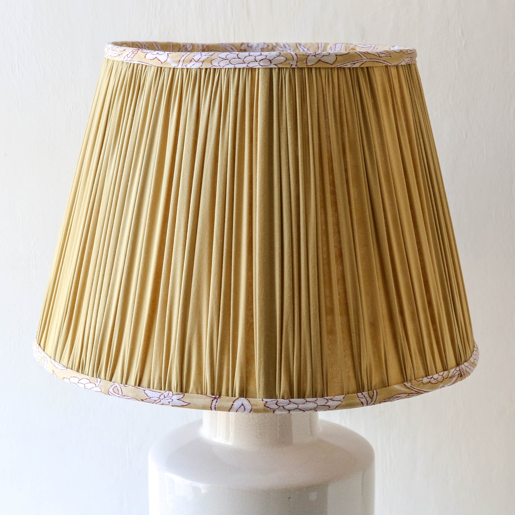 Cotton lampshade in a warm biscotti shade, lined with a co-ordinating block printed pattern.