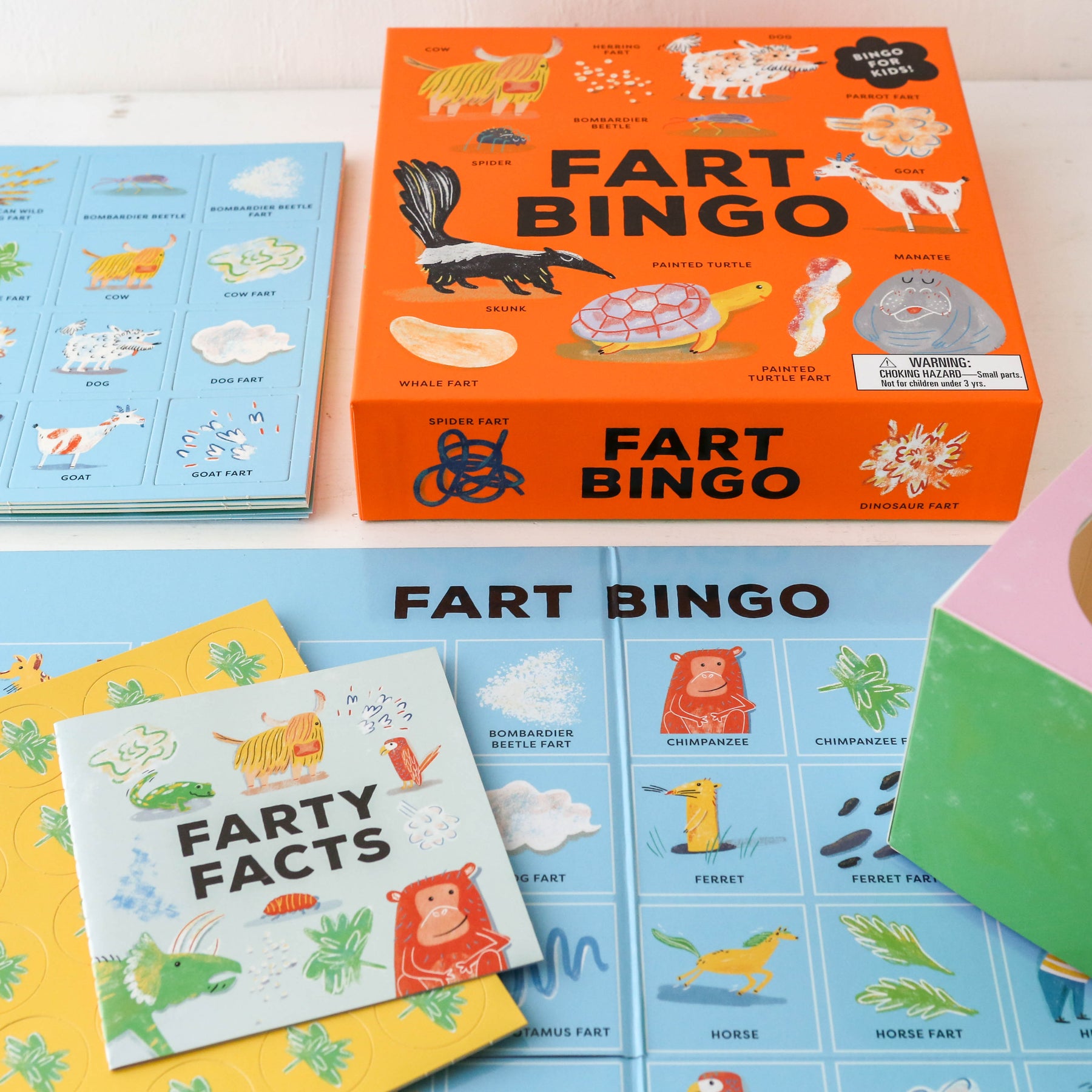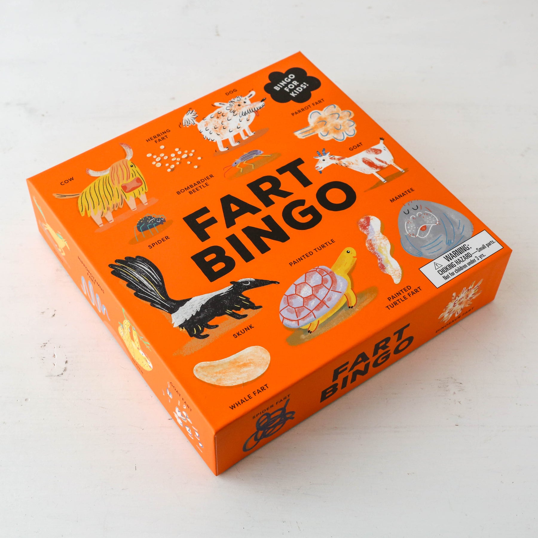 Explore the silly side of nature with 24 animals and their uniquely shaped, sized and coloured farts featured in this family bingo game. With hilarious illustrations, fascinating farty facts and quick to learn rules, Fart Bingo will have you giggling and guffawing in no time.