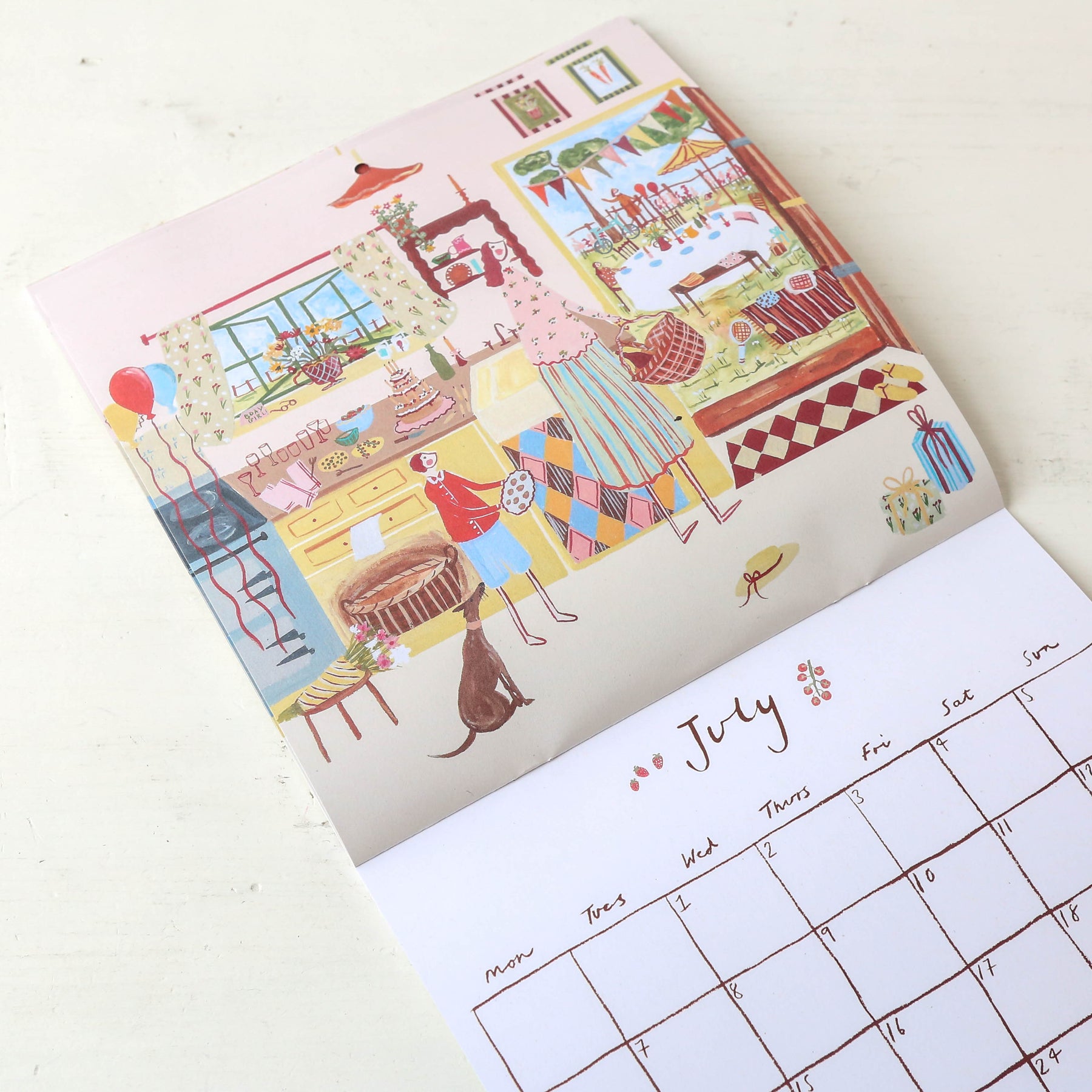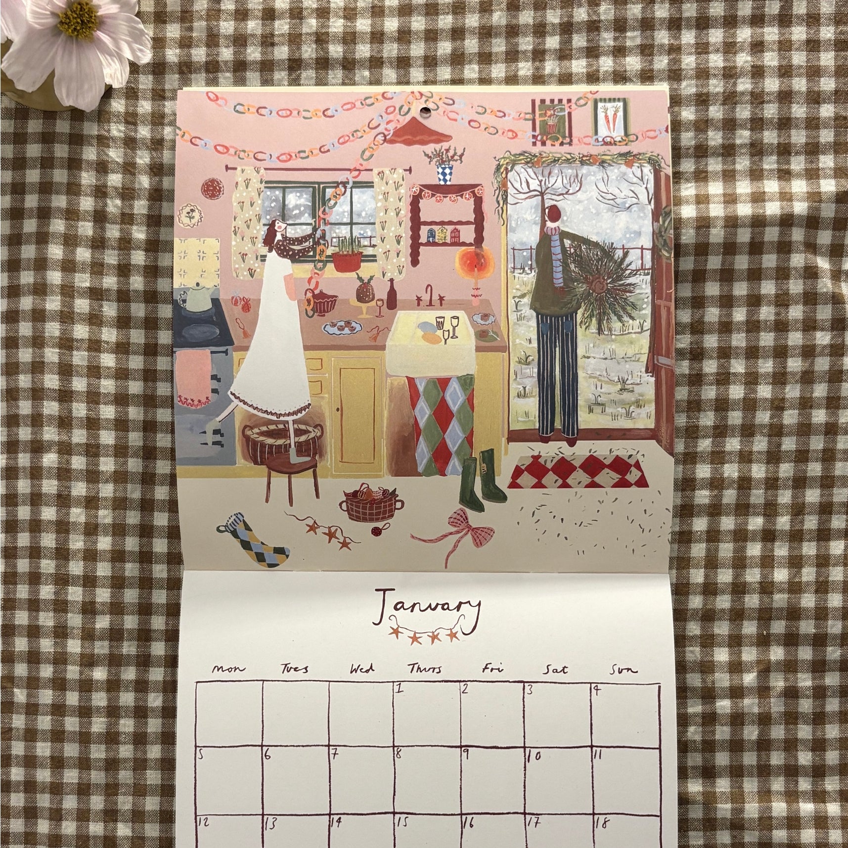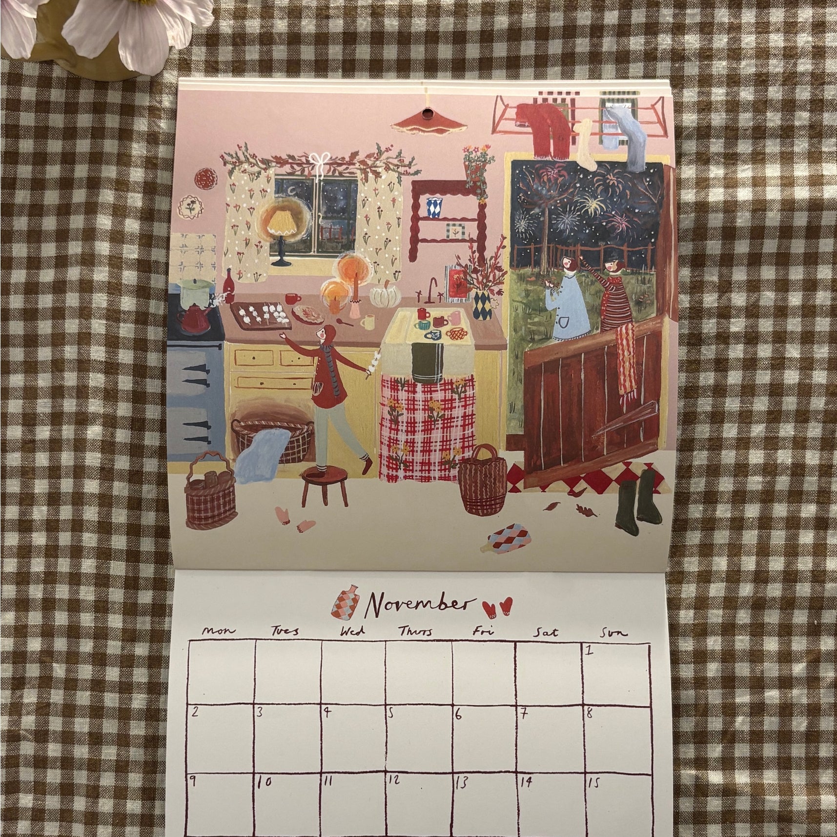 It includes 12 original gouache paintings measuring 21cm x 21cm. Each month has been hand painted, illustrating the changing of the seasons inside and outside of the home and if you look closely there's plenty of little stories going on. Each page is from the same perspective but decorated by seasonal changes.