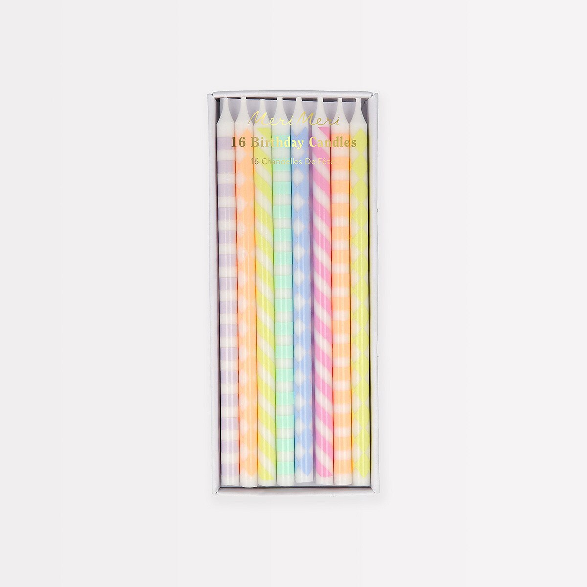 Pastel Stripe and Bright Diagonal contain 24 candles.