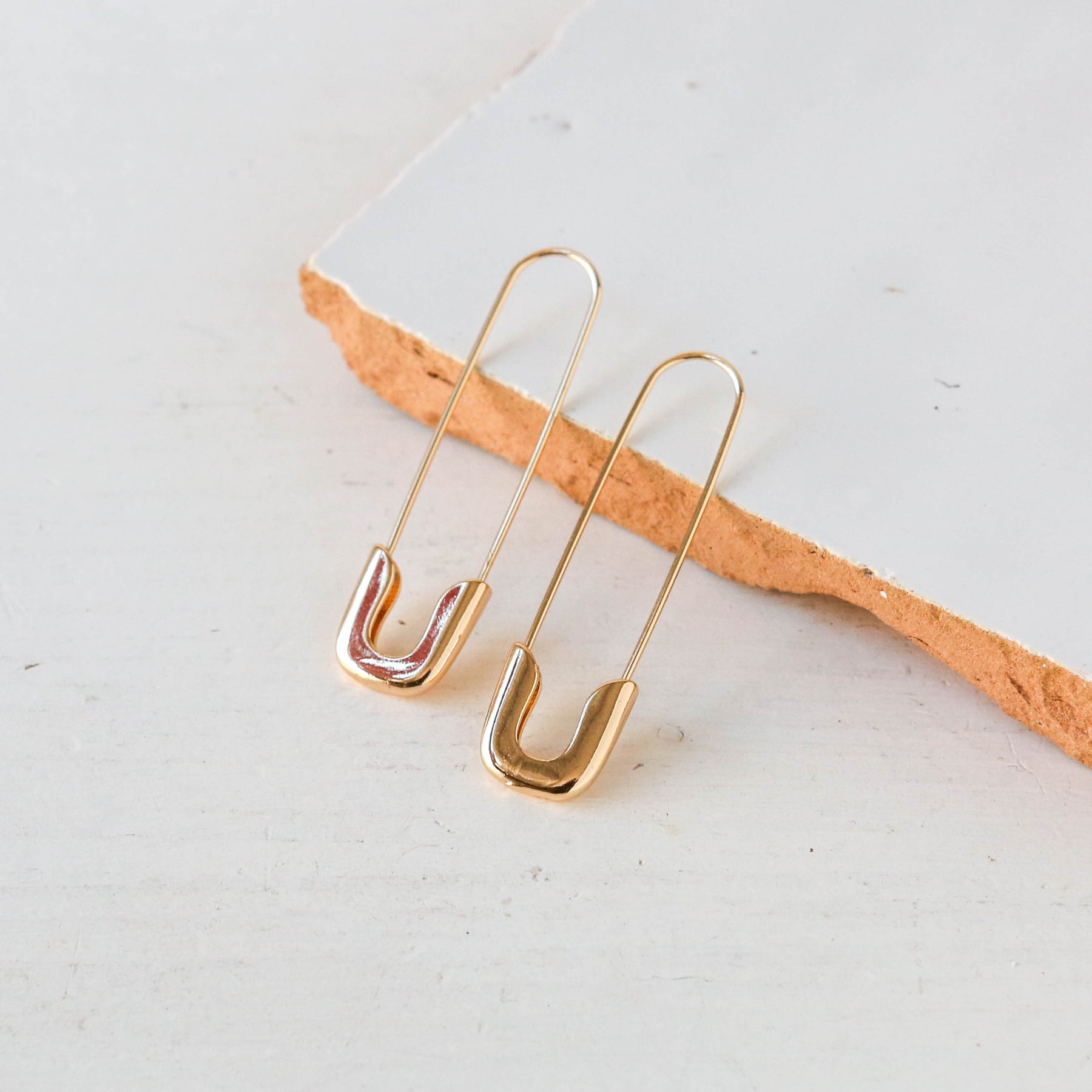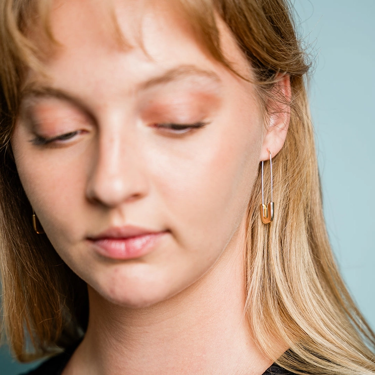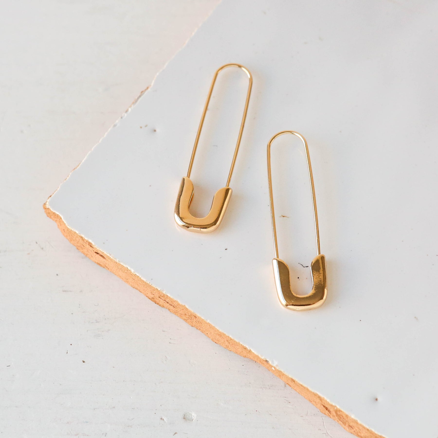 Lightweight 'Safety Pin' style earrings; oversized and made of gold plated brass.