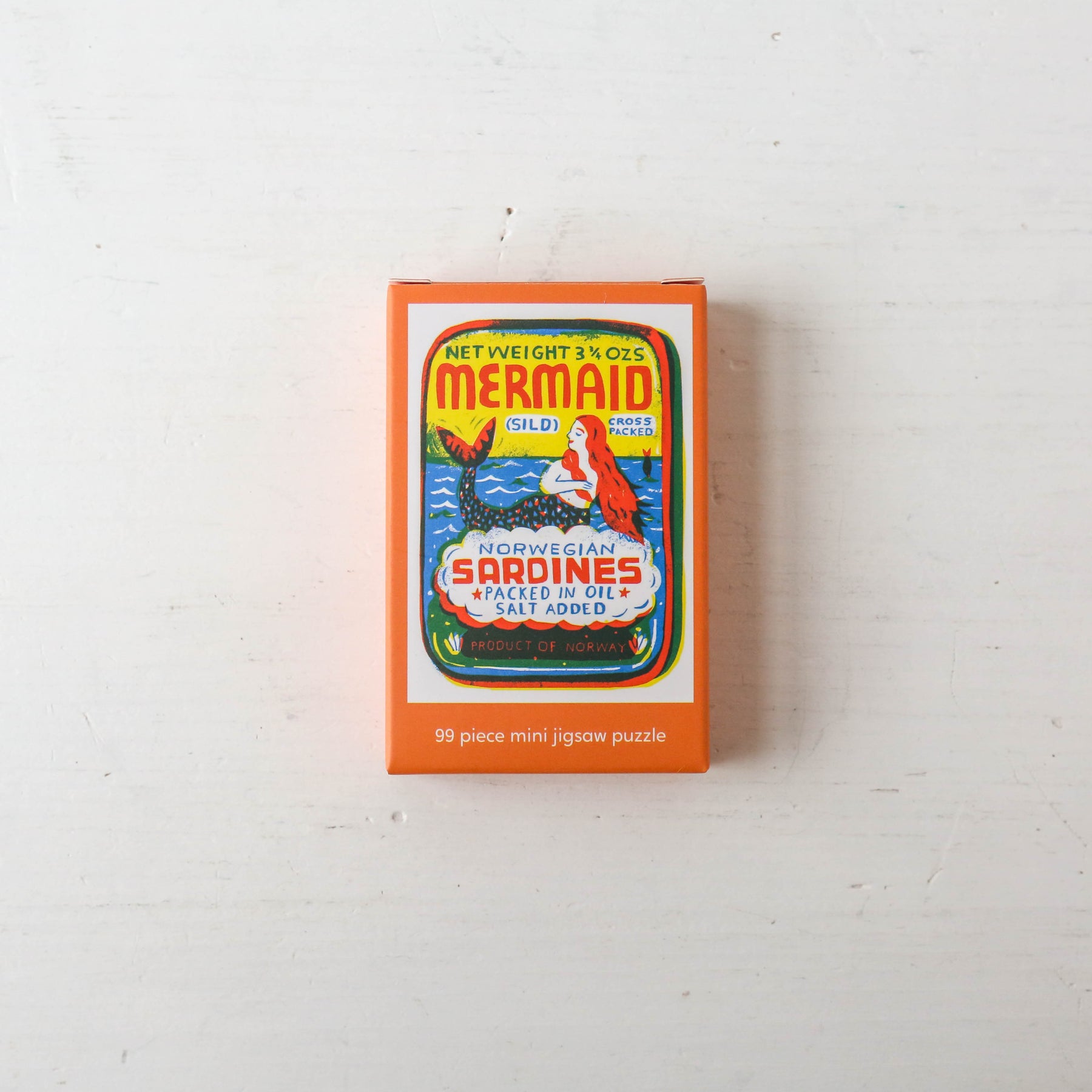 99 Piece Mini Jigsaw Puzzle featuring a fun illustration of a tin of Sardines by Louise Lockhart.