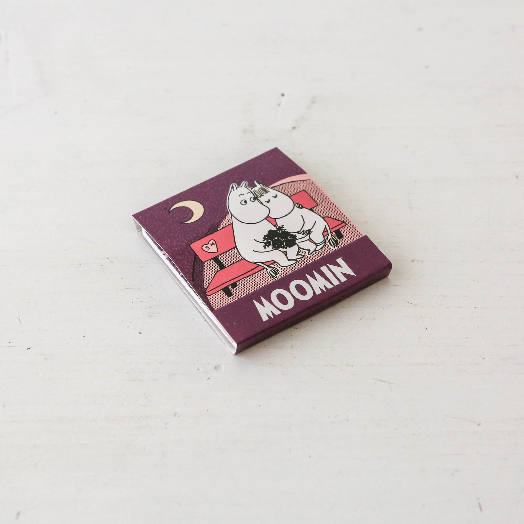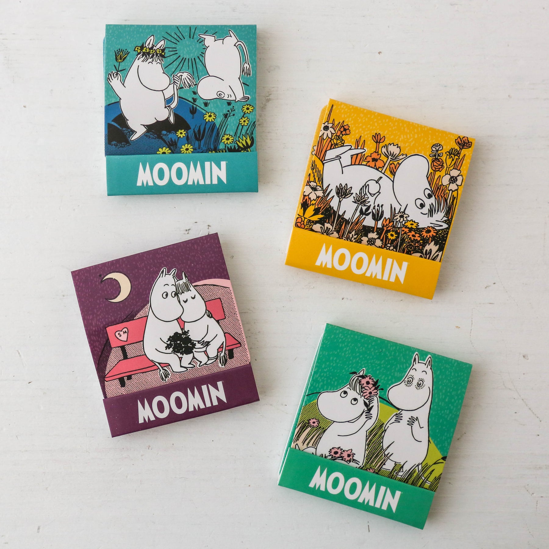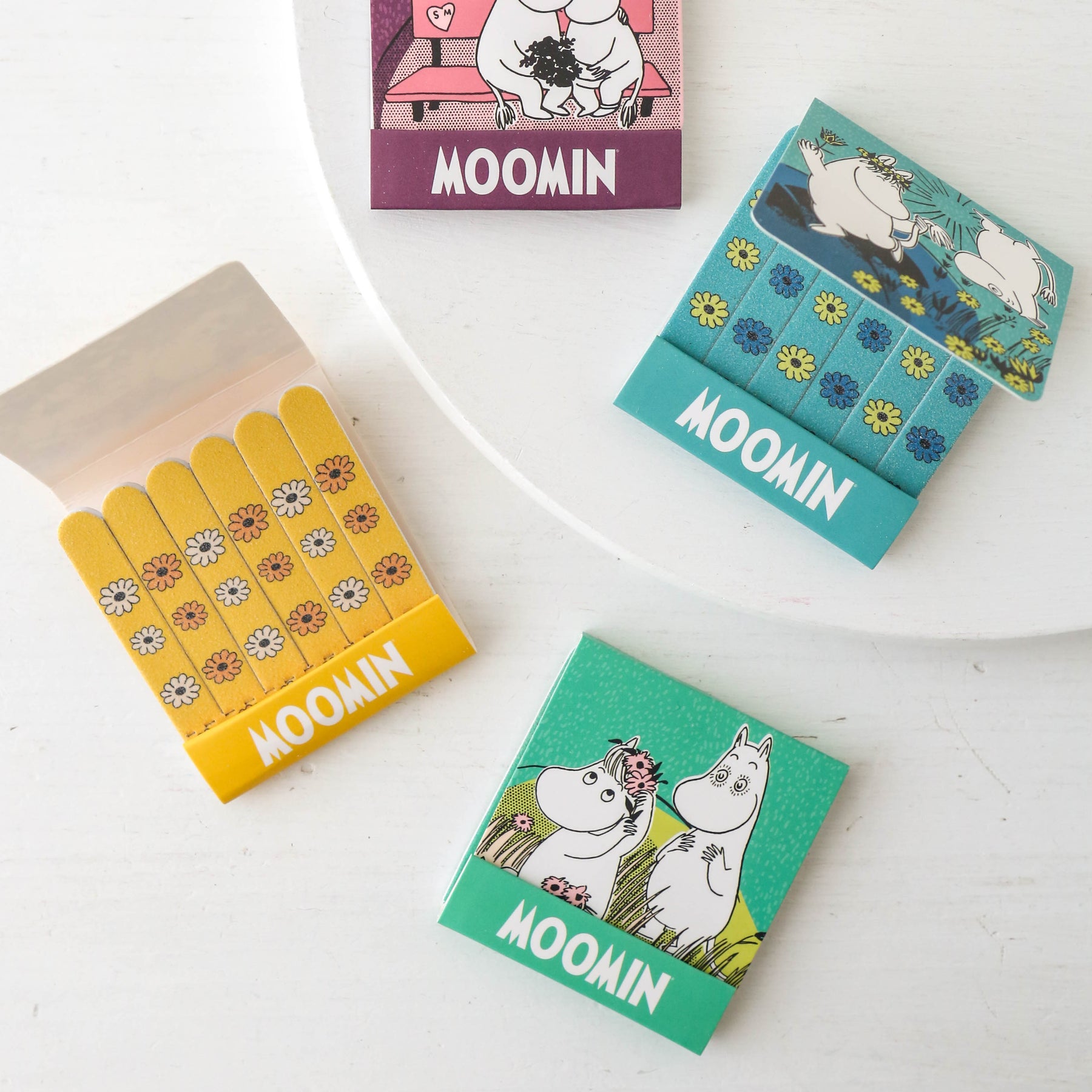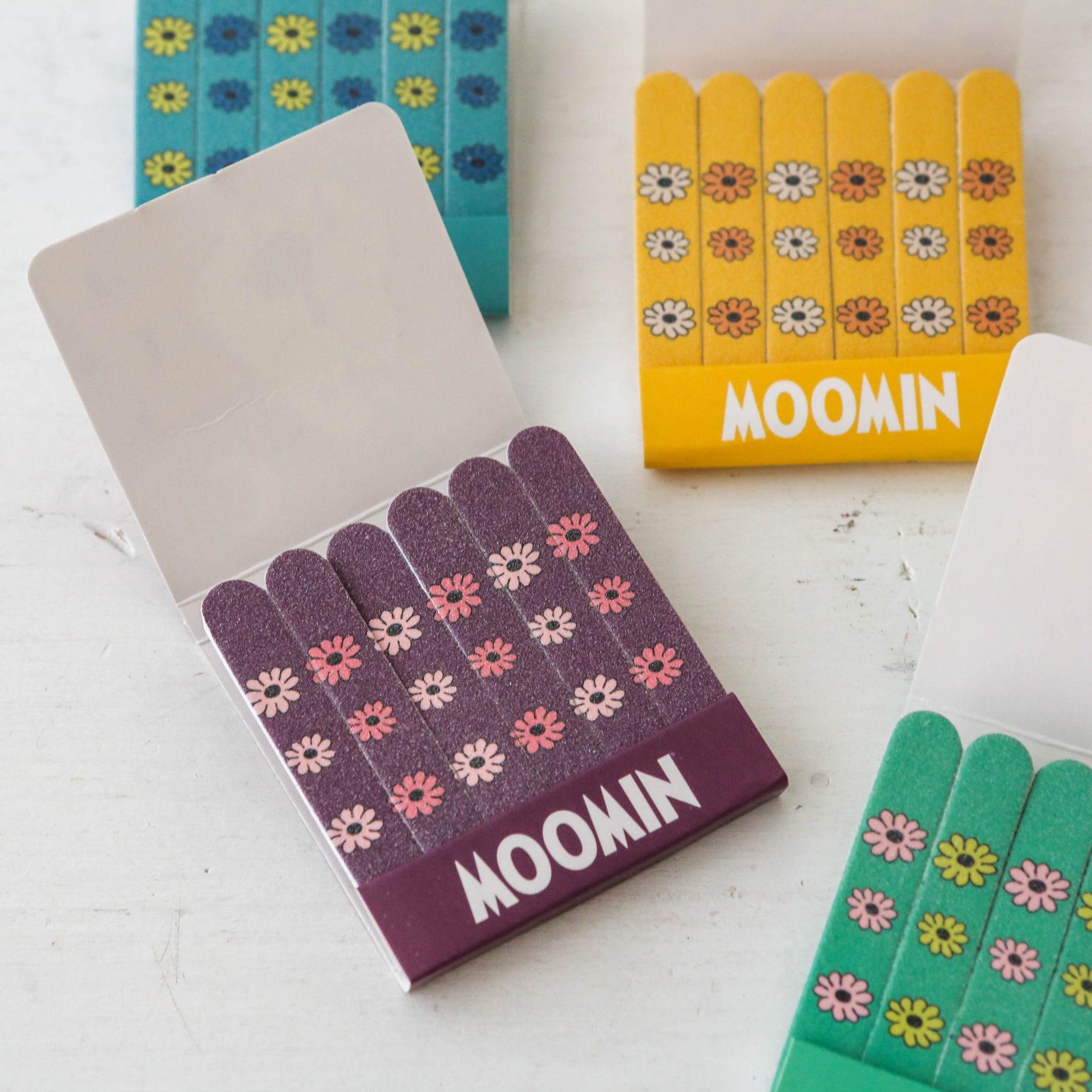 Mini nail files, in match-book style packaging. Available in 4 colours, featuring different scenes from Tove Jansson's classic books. Inside are 6 mini nail files, with Moomin-flowers printed on them.