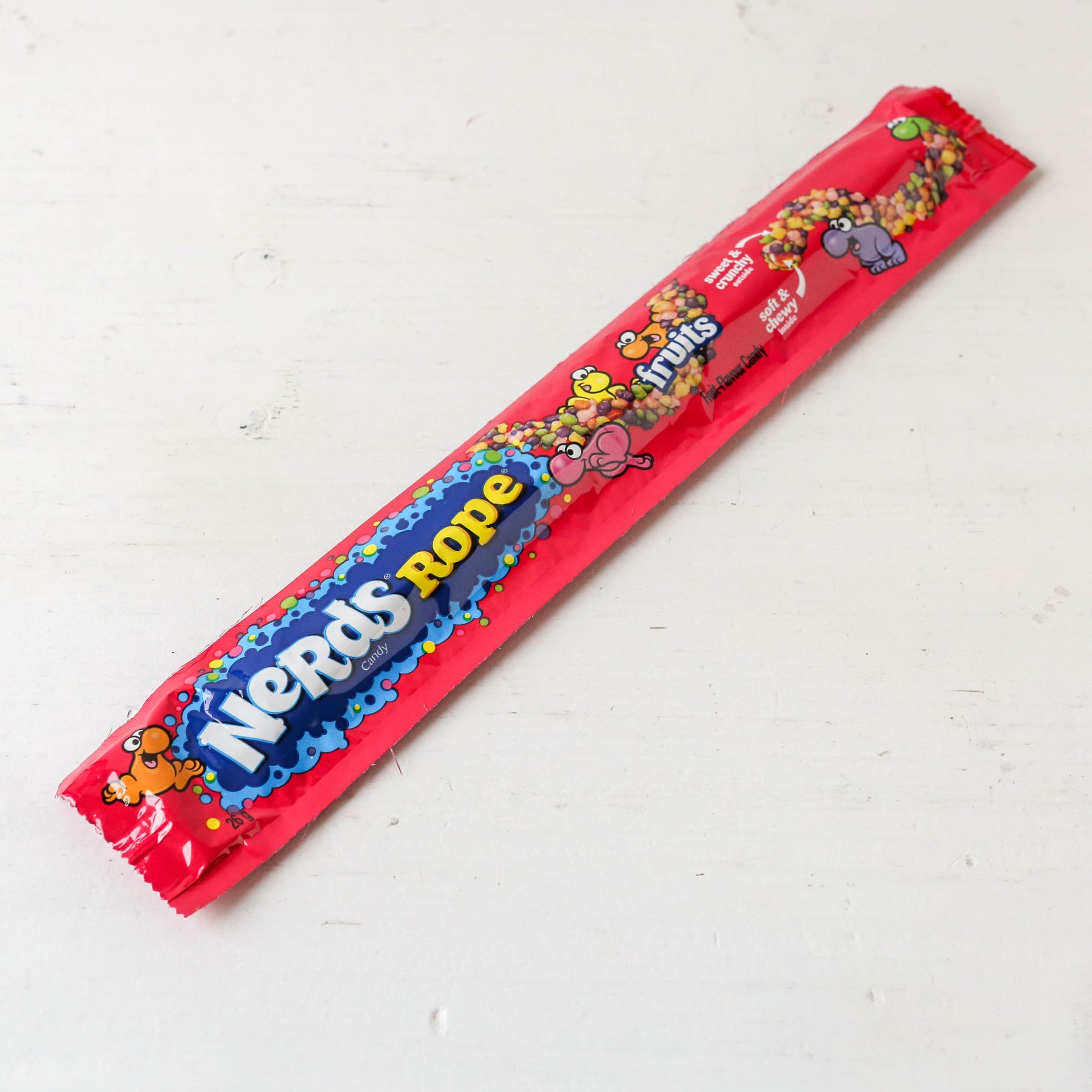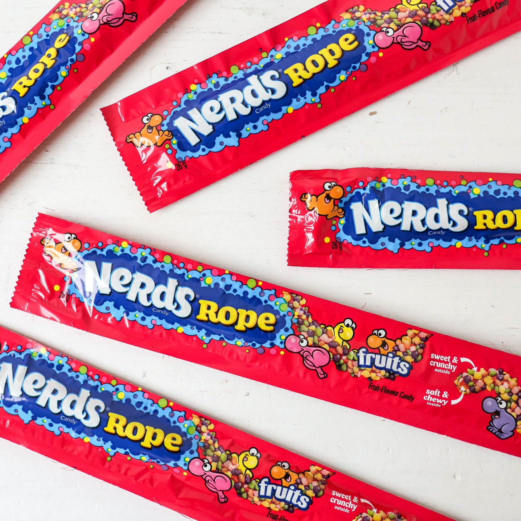 A chewy fruity string with the iconic crunchy Nerds stuck on top, they're soft and chewy on the inside but sweet and crunchy on the outside.