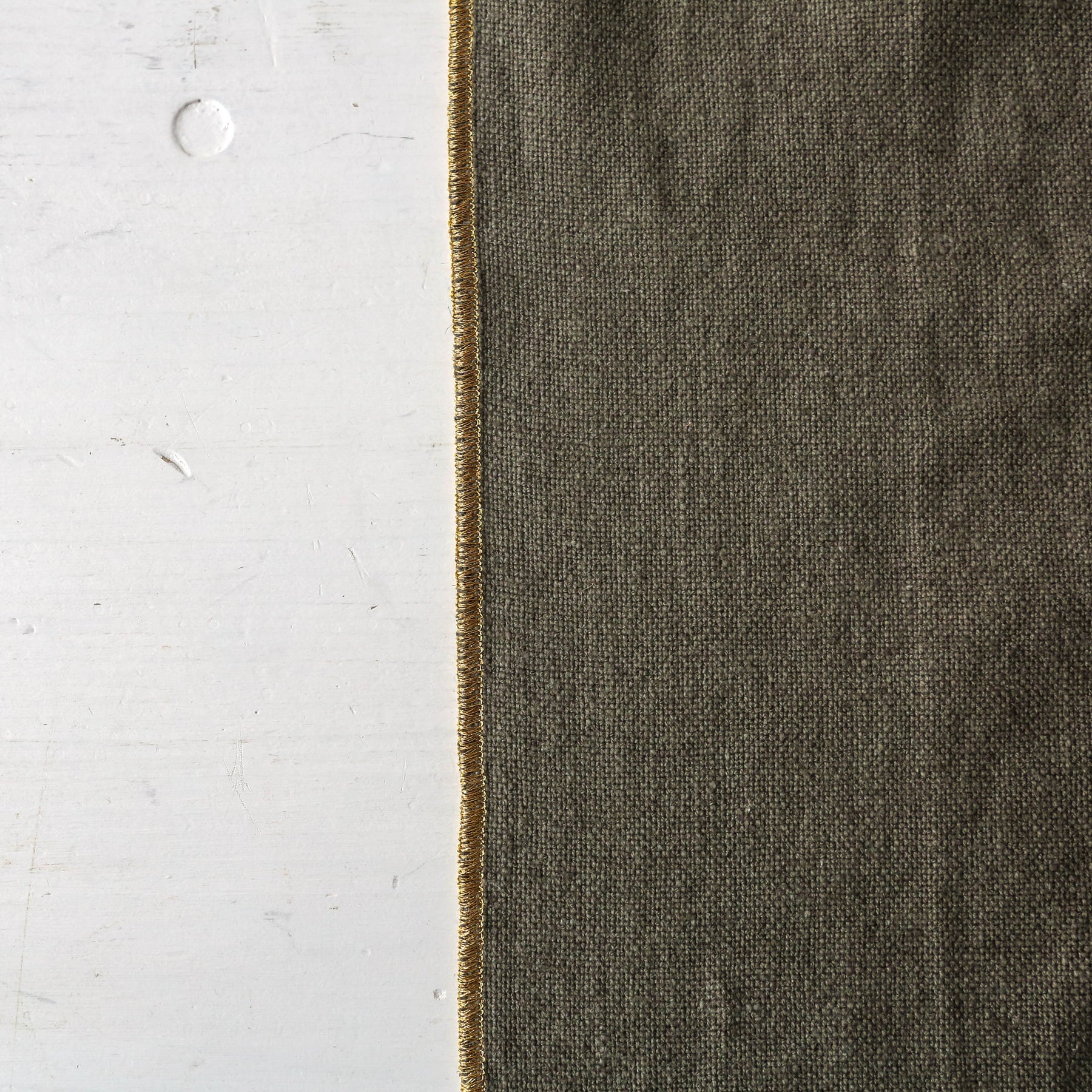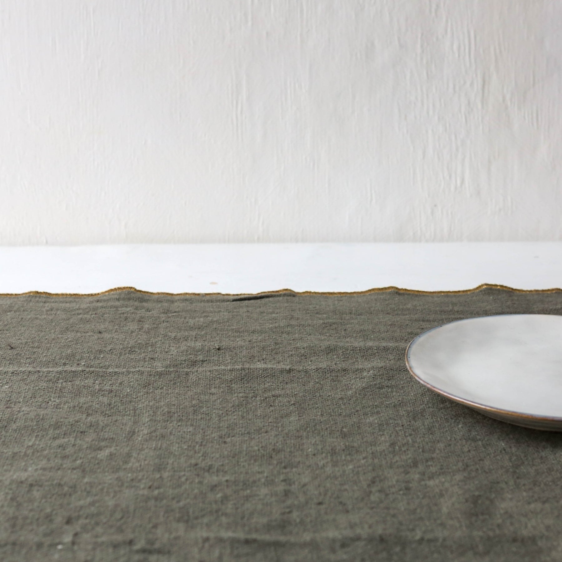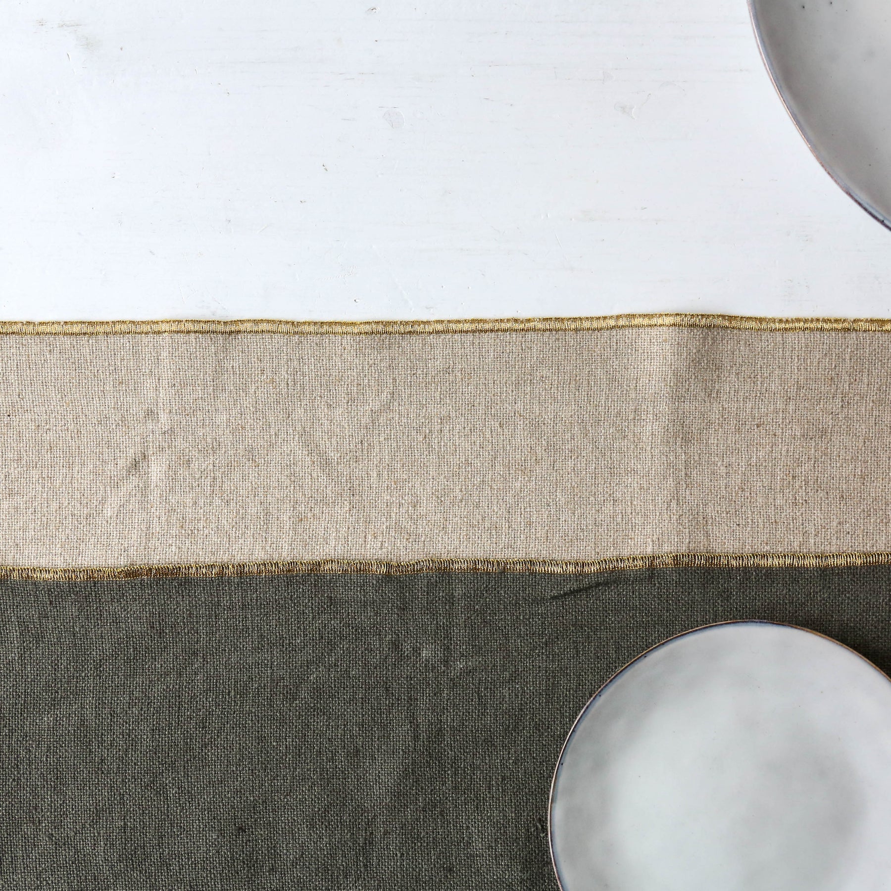 Linen/cotton blend table runner, with a fetching golden border.