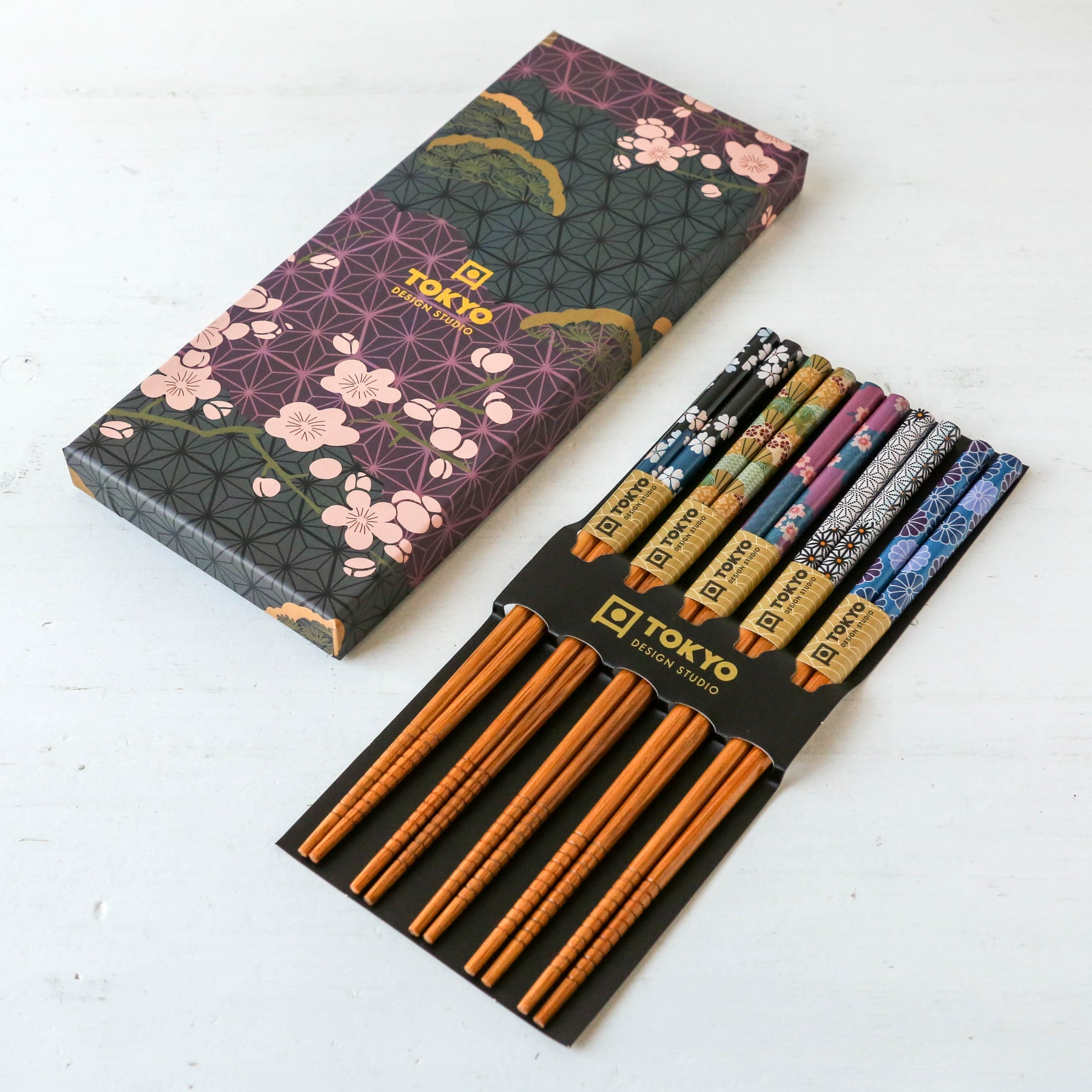 A decorative gift box containing 5 pairs (for luck!) of chopsticks.