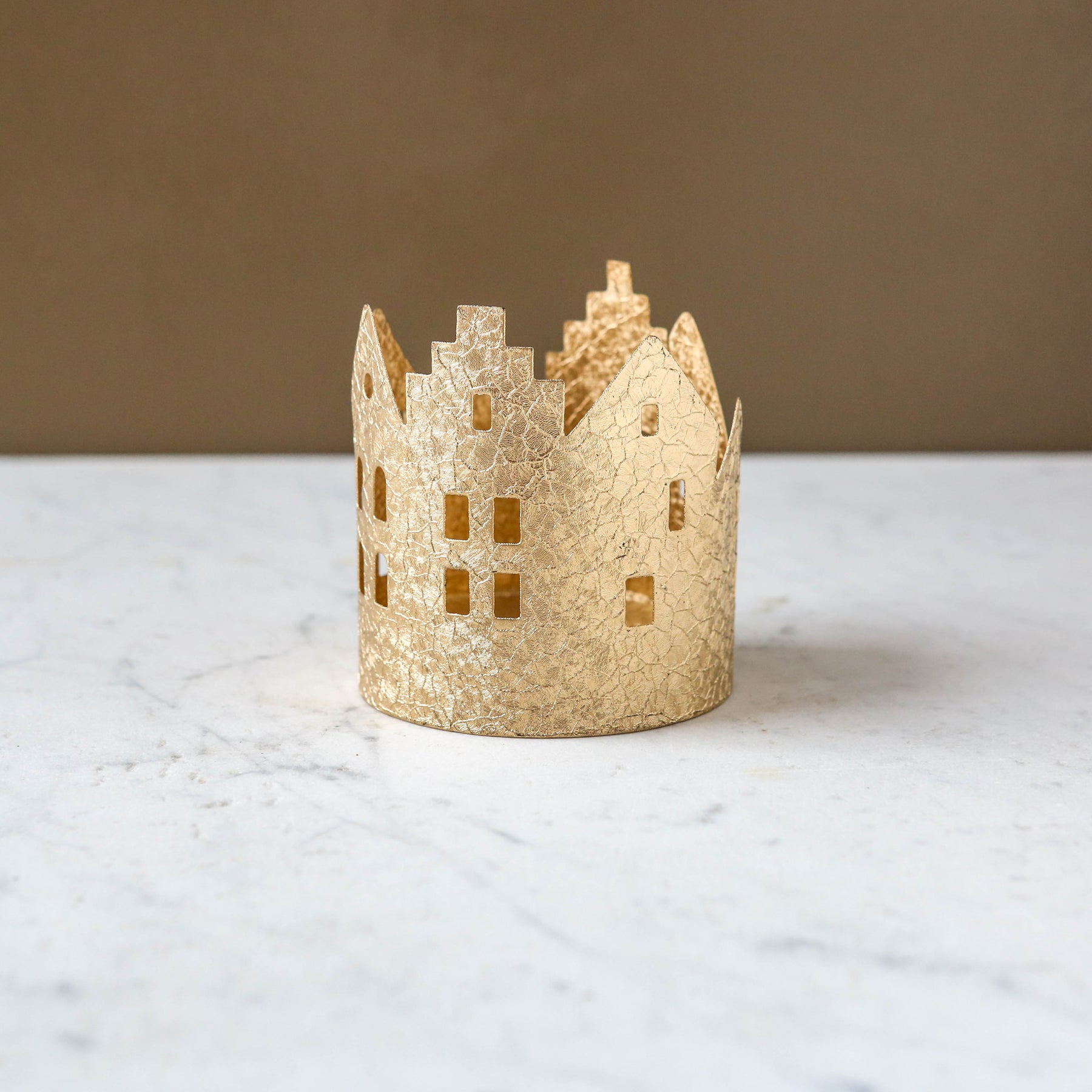 The Nille Votive Candle Holder is made of a beautiful gold finished metal. The design is inspired by townhouses, with carved windows and details that allow the light to shine through in an atmospheric way.