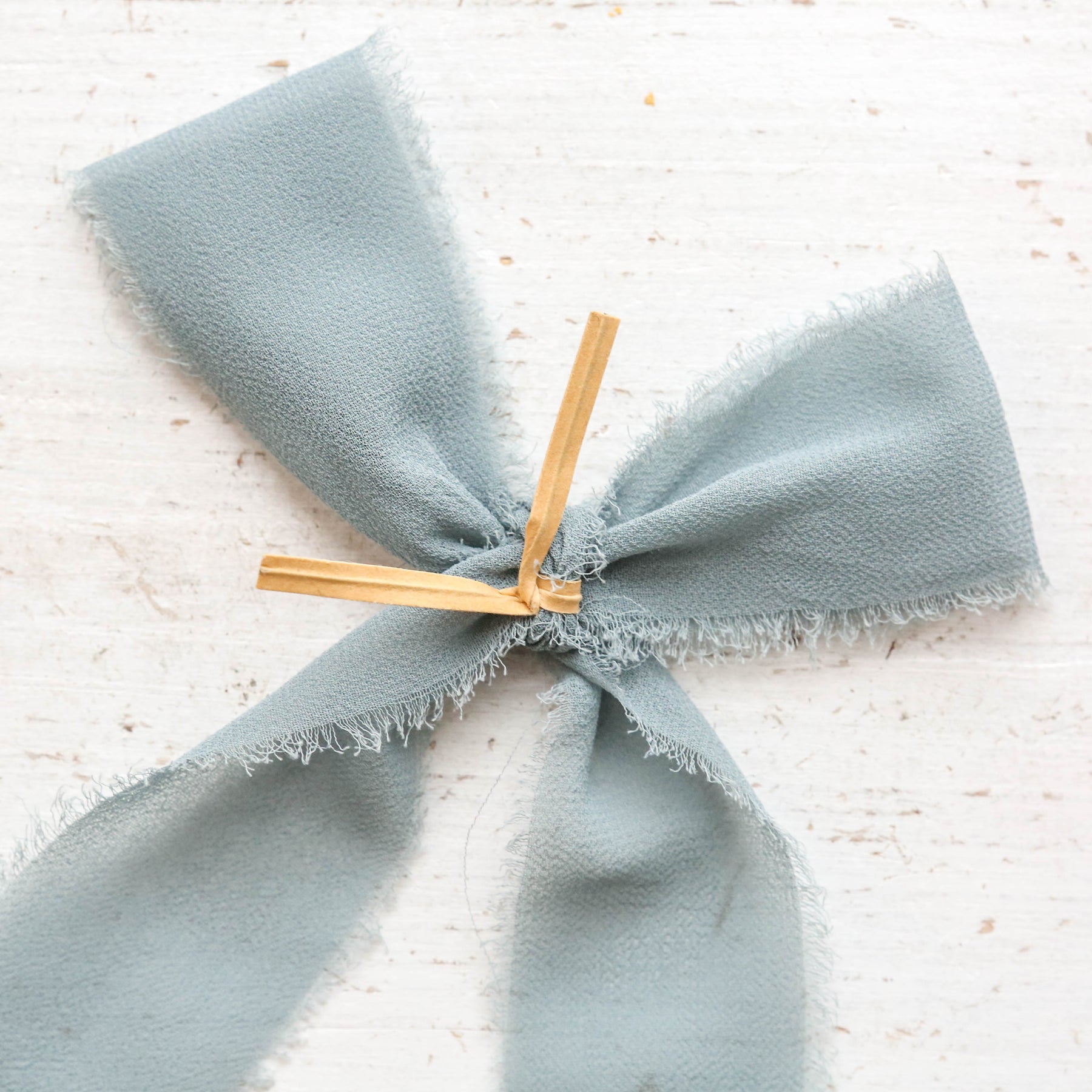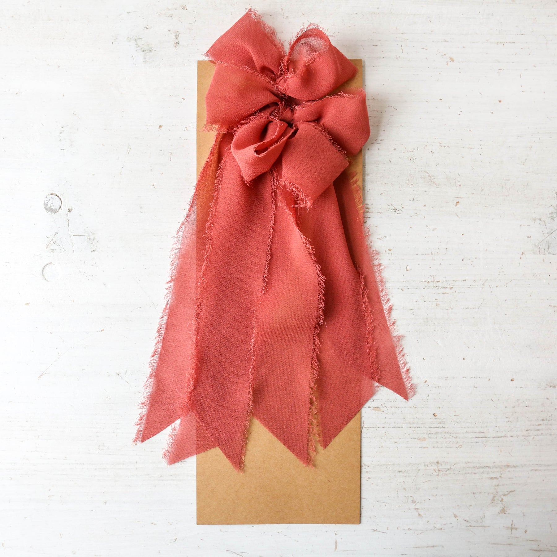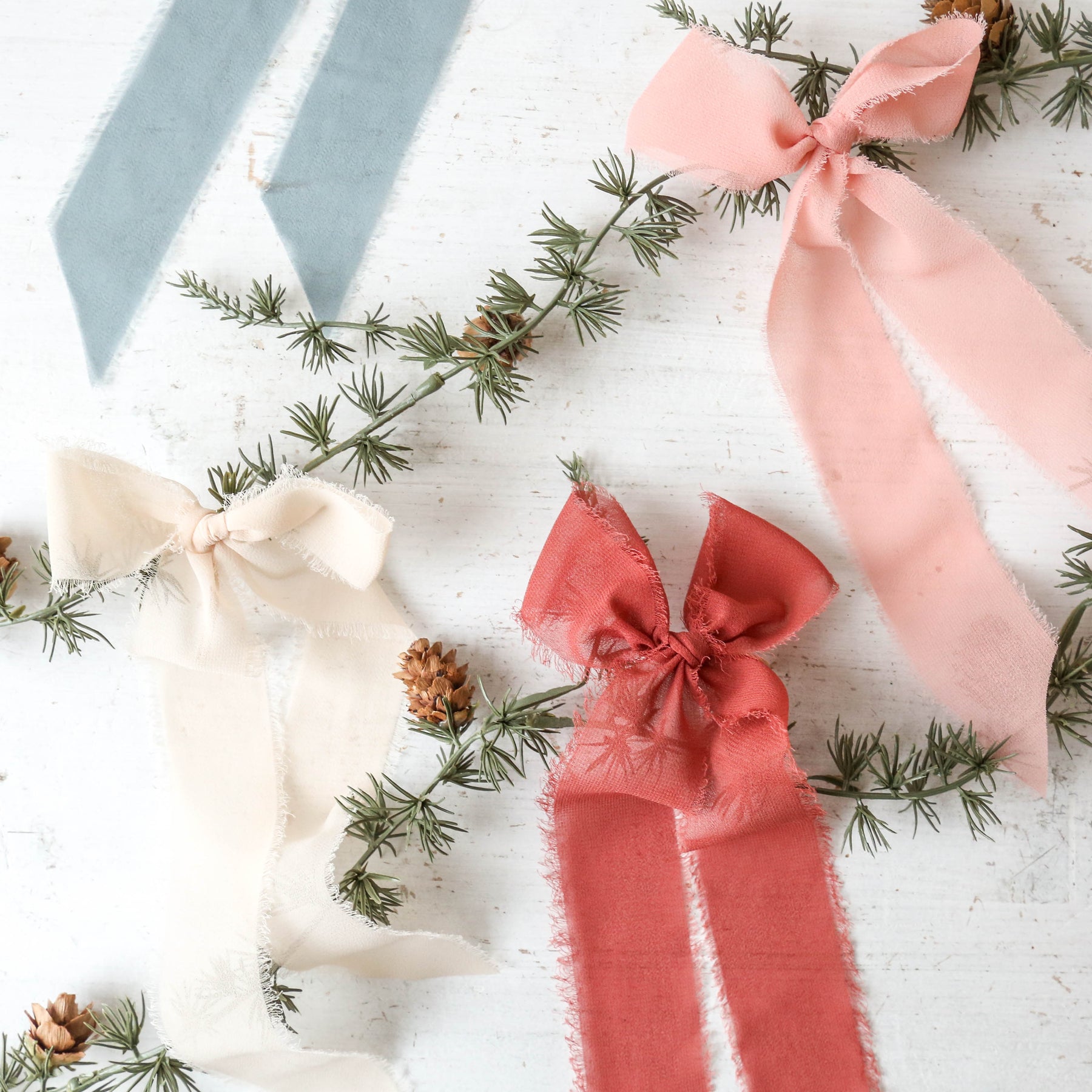A pack of three, perfectly-tied tree bows, in a raw finished, chiffon ribbon. Chiffon is fabulously drape-y, for a bow that doesn't look like it's trying too hard. Perfect. Add to your tree, wreath or foliage display.