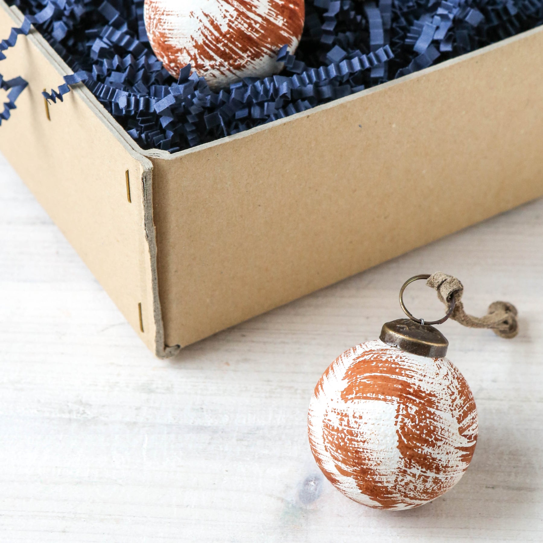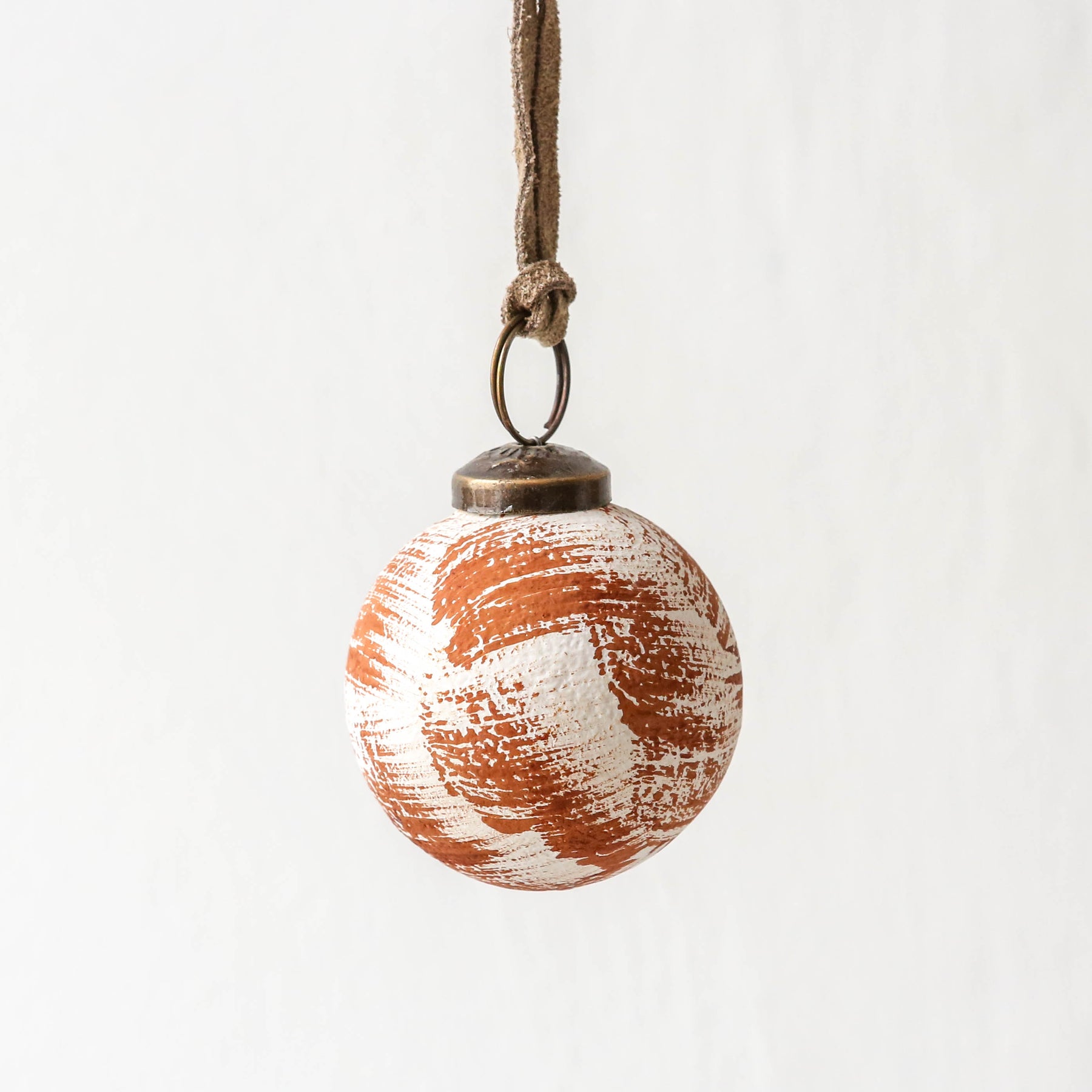 A hand-blown glass bauble, dipped in Plaster of Paris, and a hand-finished with a brushed paint design. This is a chalky, matt finished bauble.