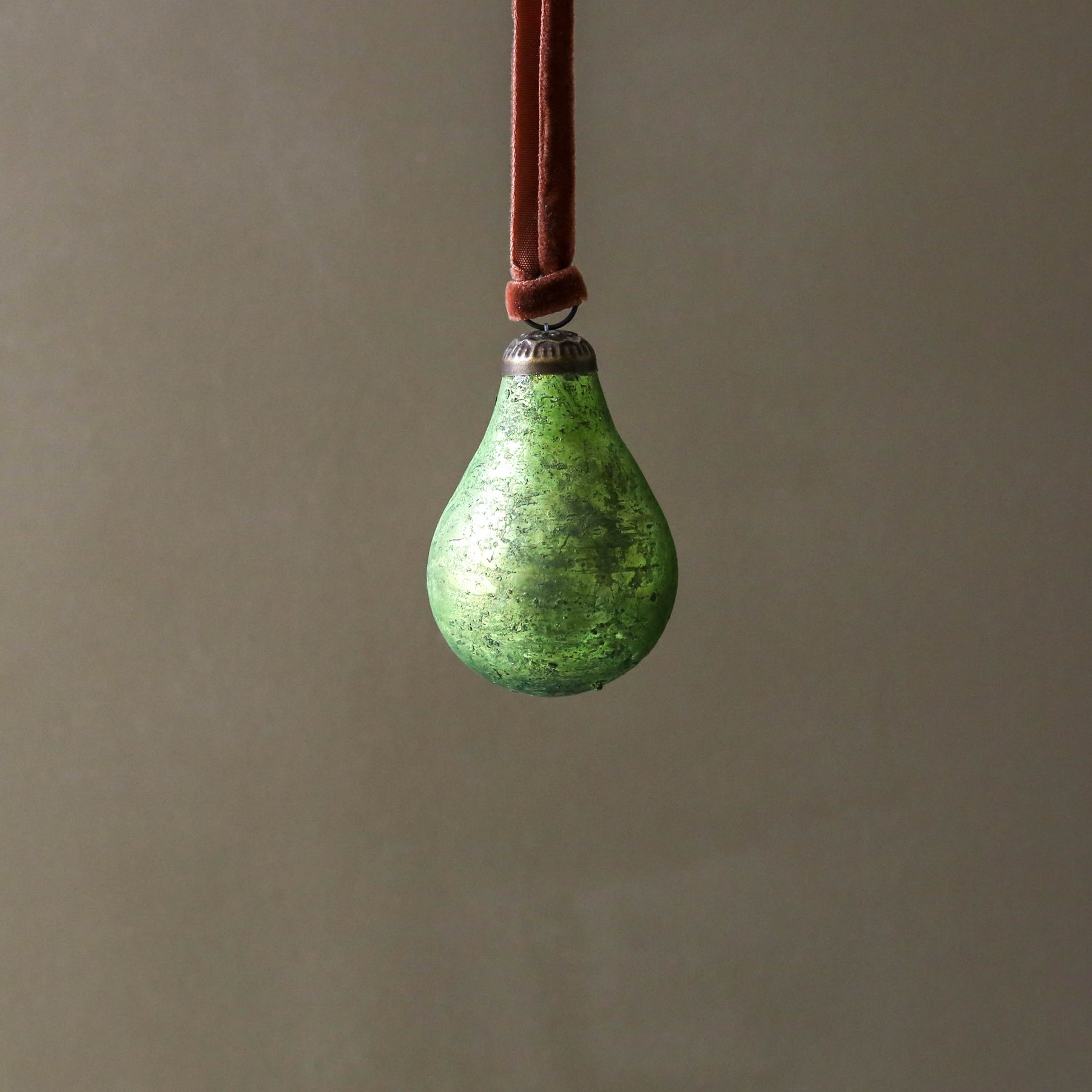 A pretty glass pear decoration. Finished with a metal cap and hung on a velvet ribbon.