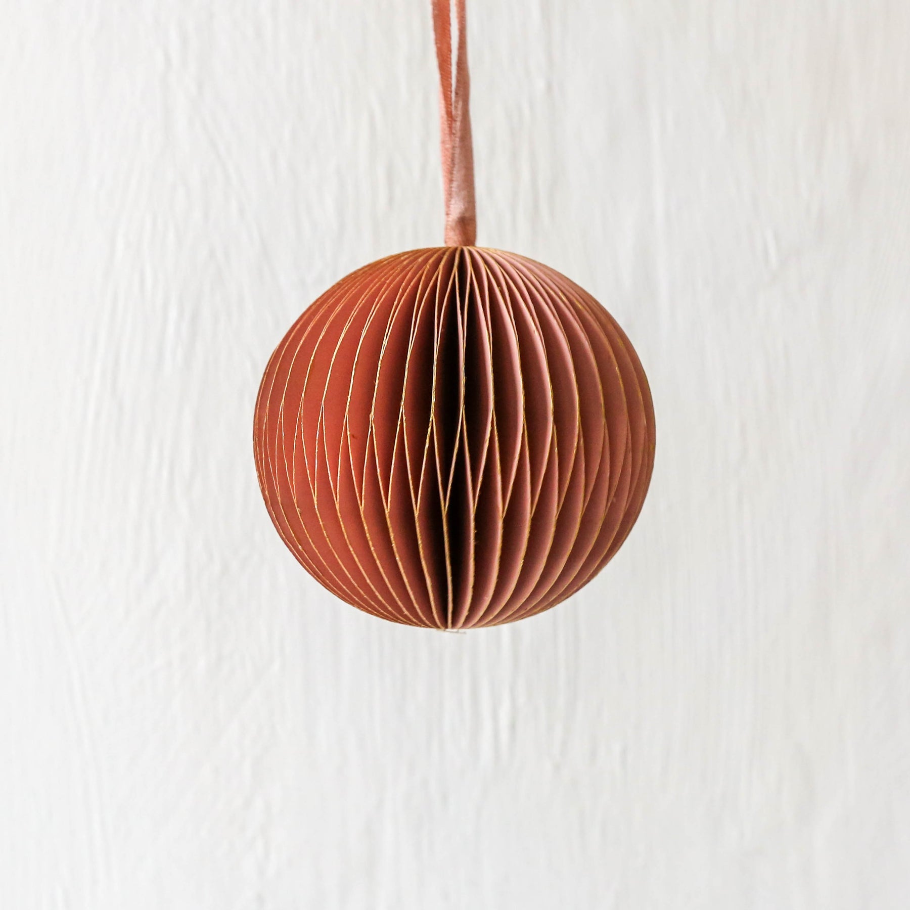 A boxed set of six pleated paper hanging decorations. Each has a subtle gold edge.