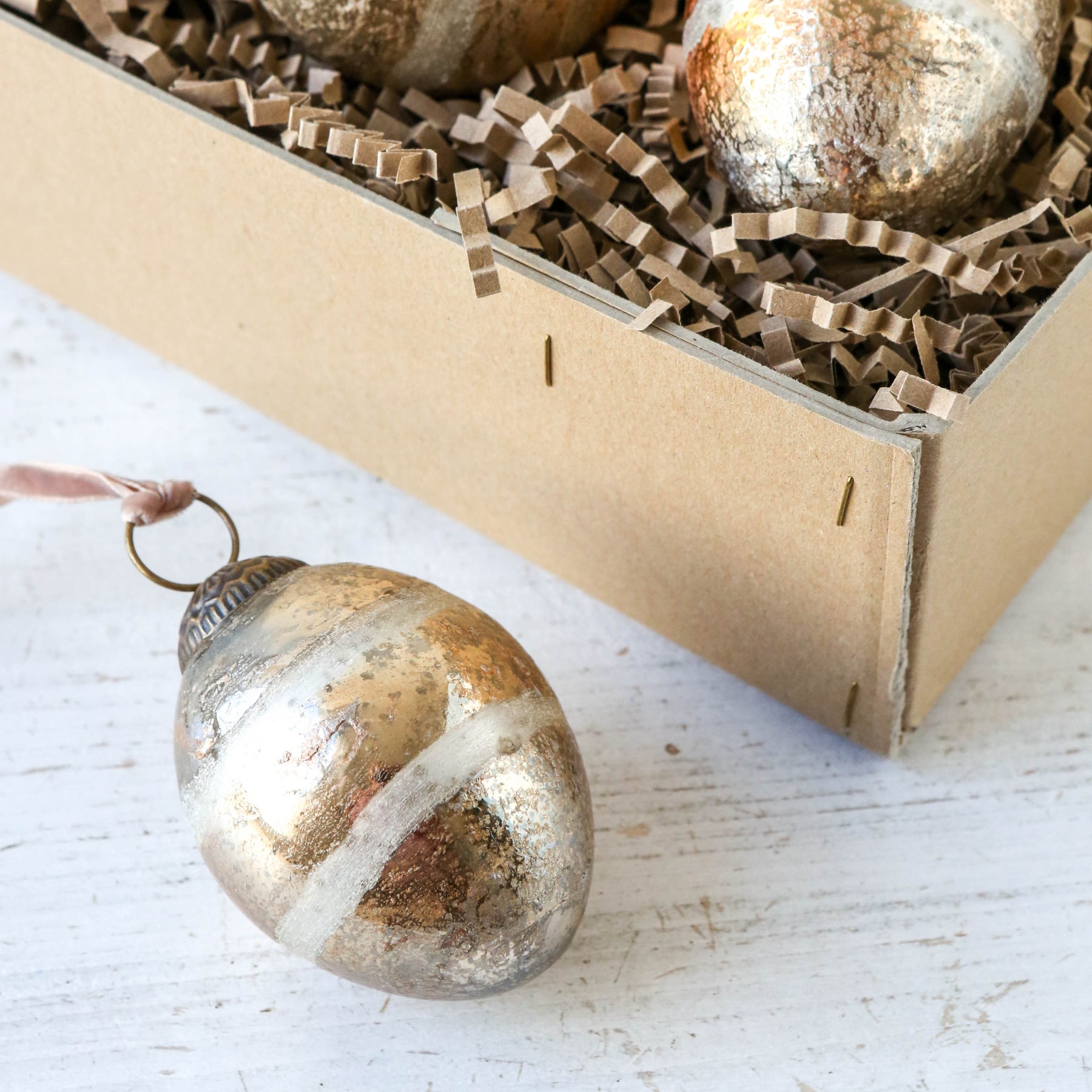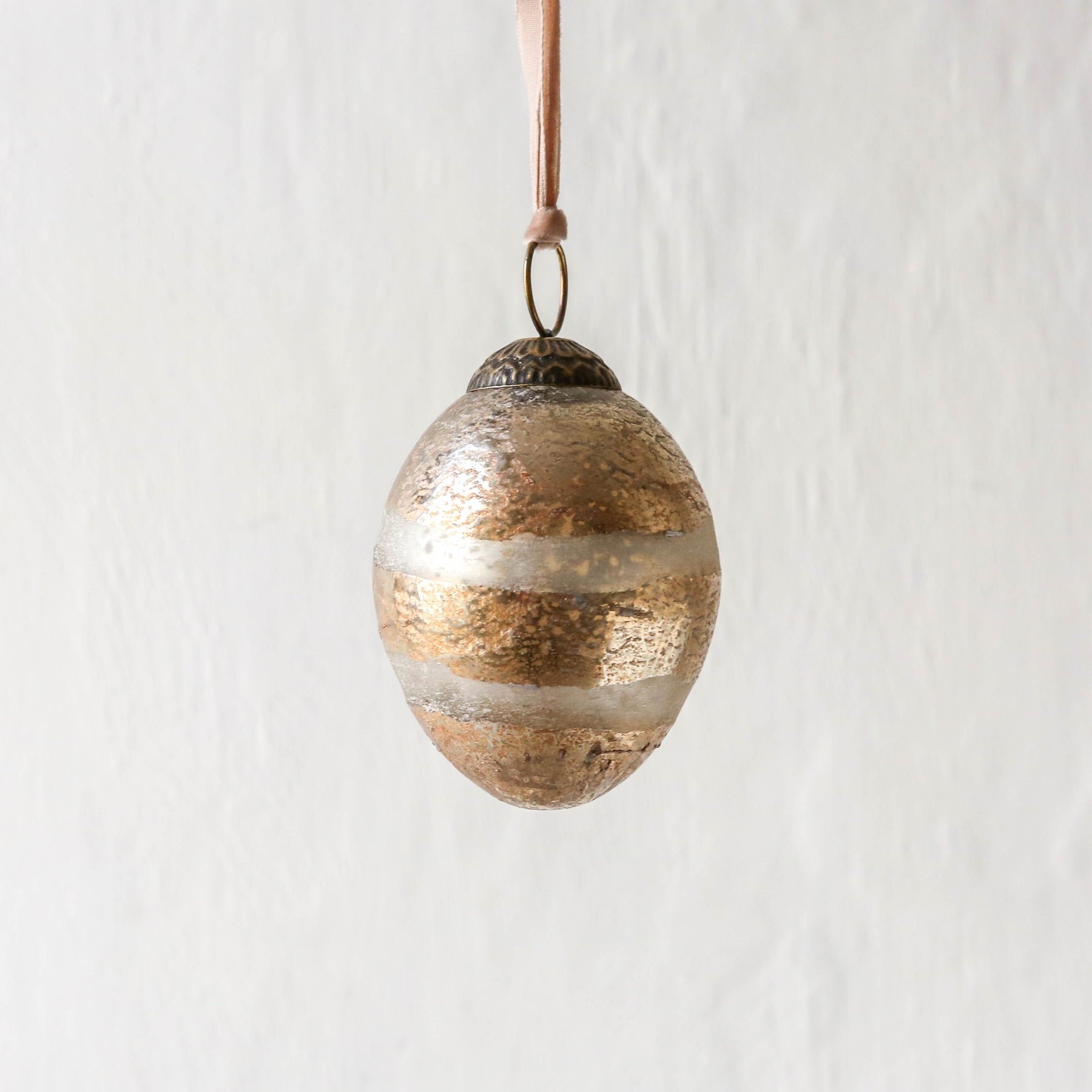 This elegantly shaped Viti Gold Bauble in pared-back tones of antique gold and silver has a wonderfully irregular striped pattern.