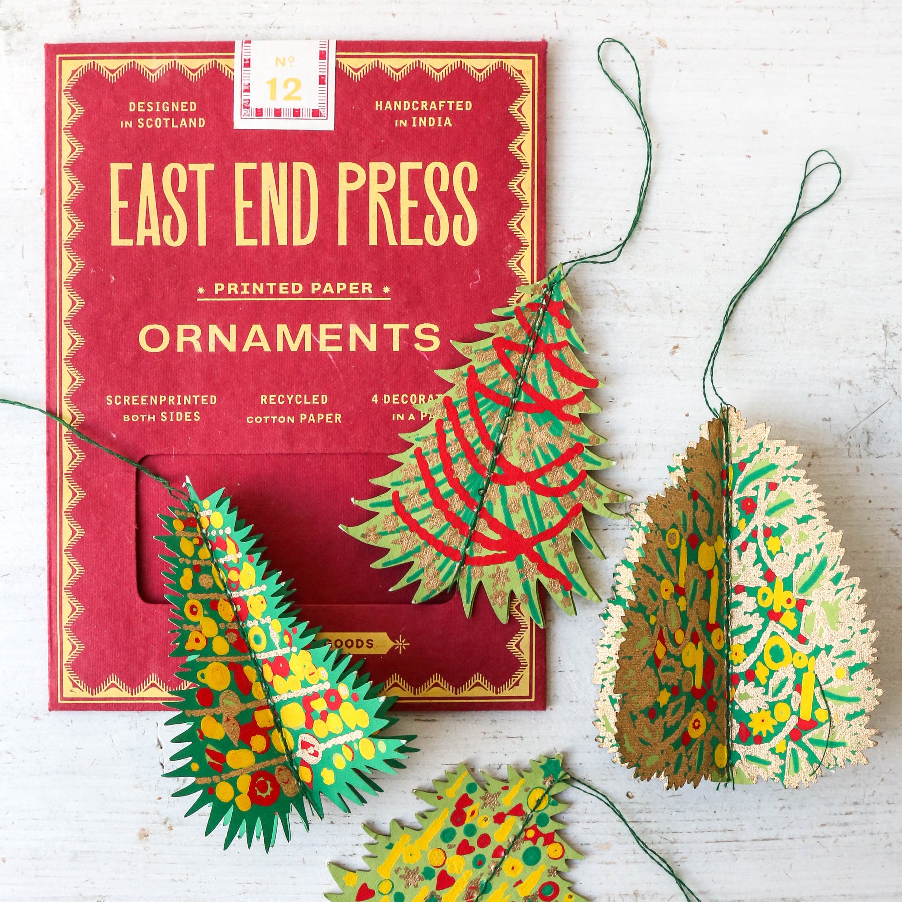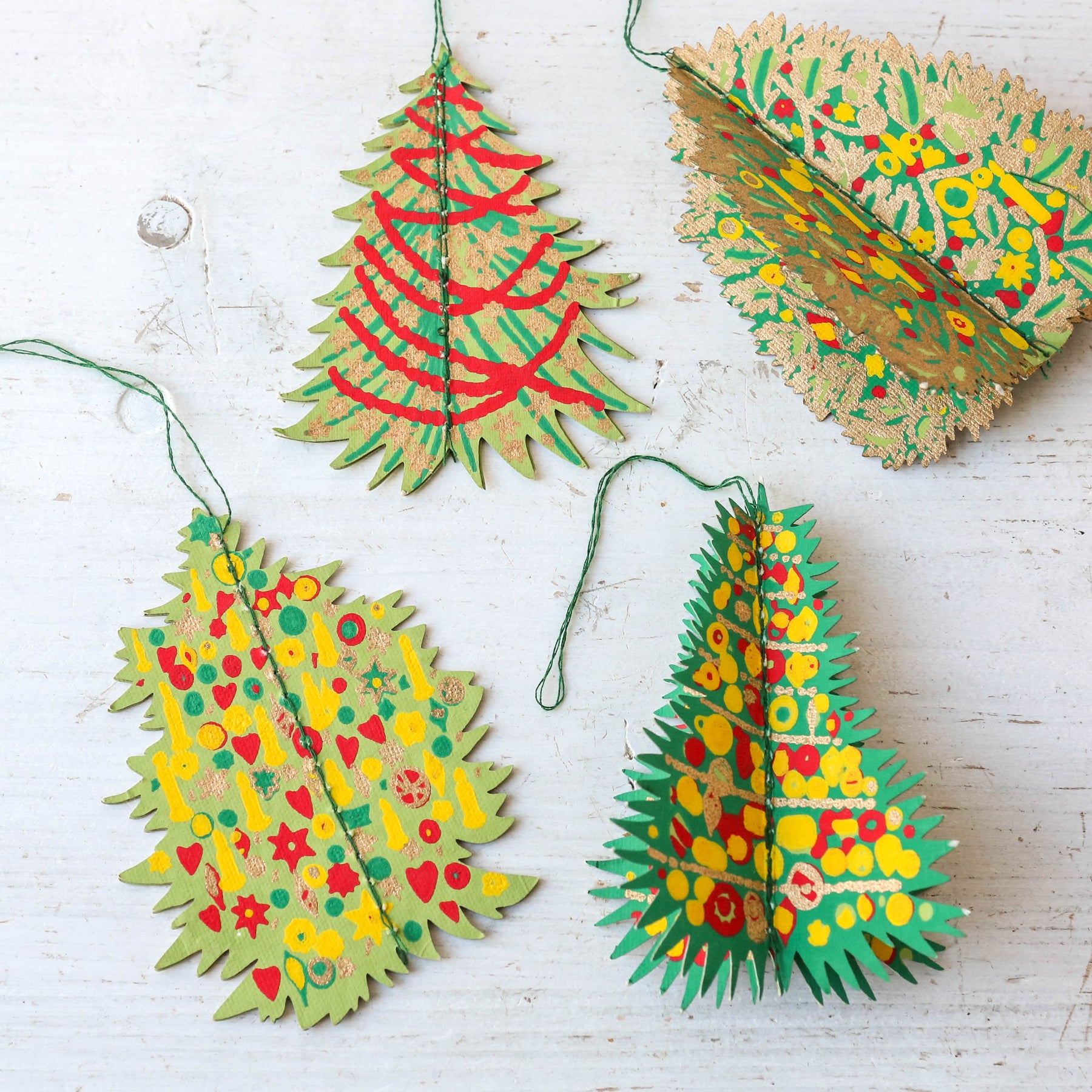 Four fold out decorated paper Christmas trees. Each has a hanging cotton loop, and is ready to decorate your home.
