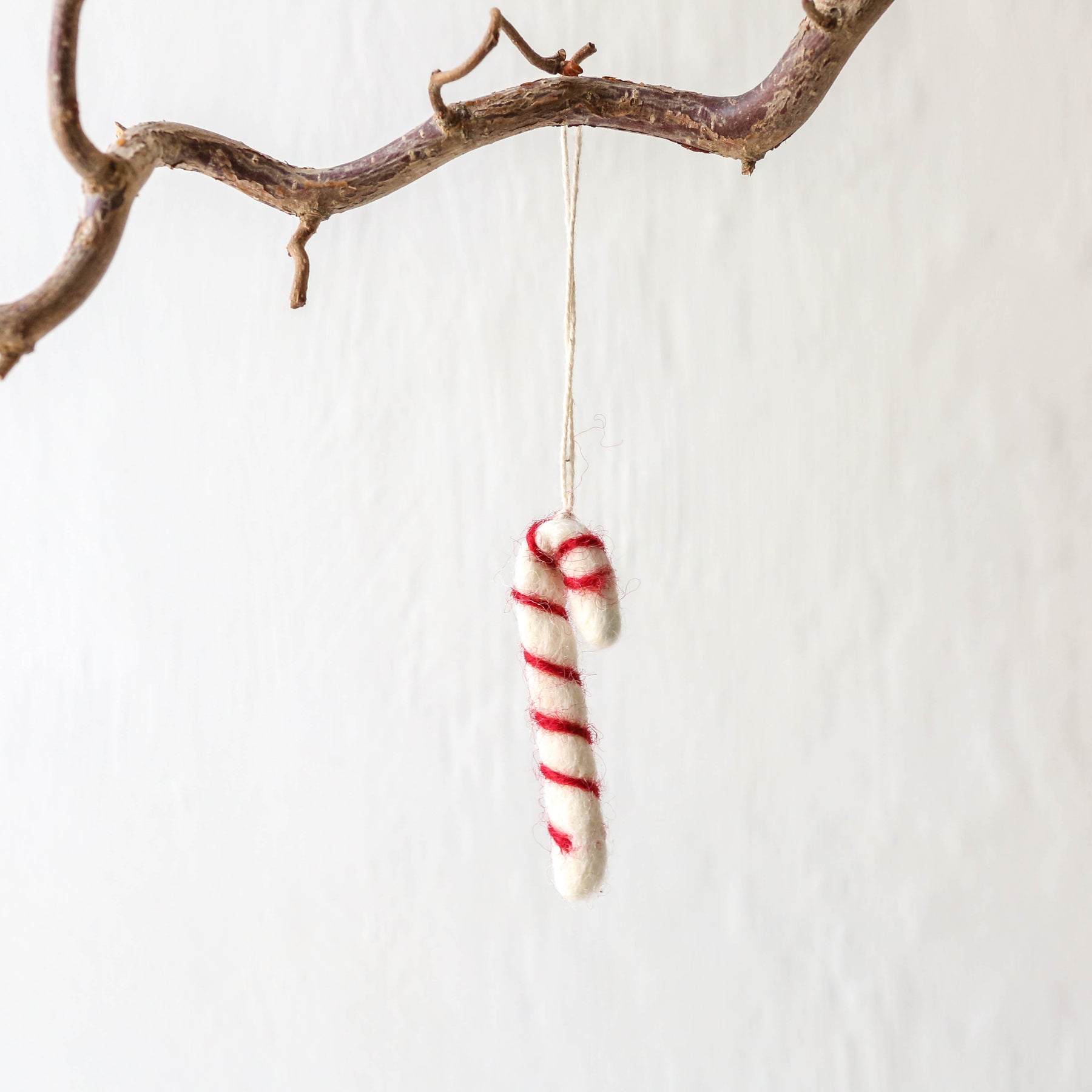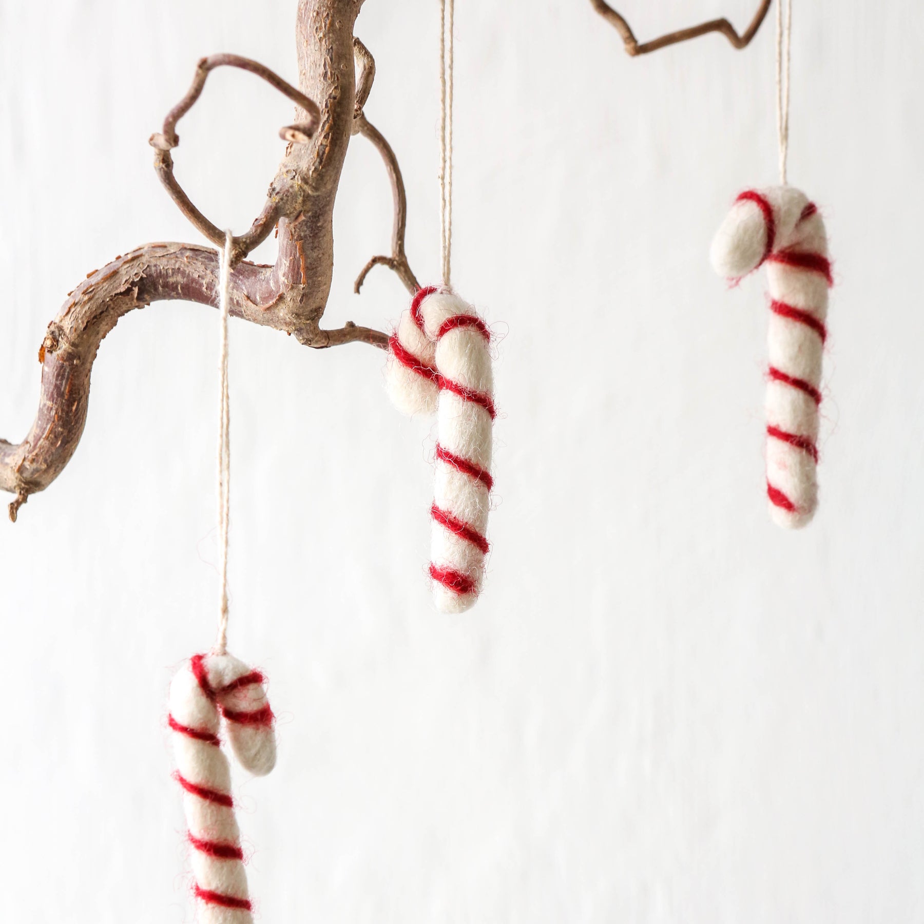 Candy Cane shaped wool felt hanging decoration. They come with a cotton string loop to hang on your Christmas tree, or can be attached to a present.