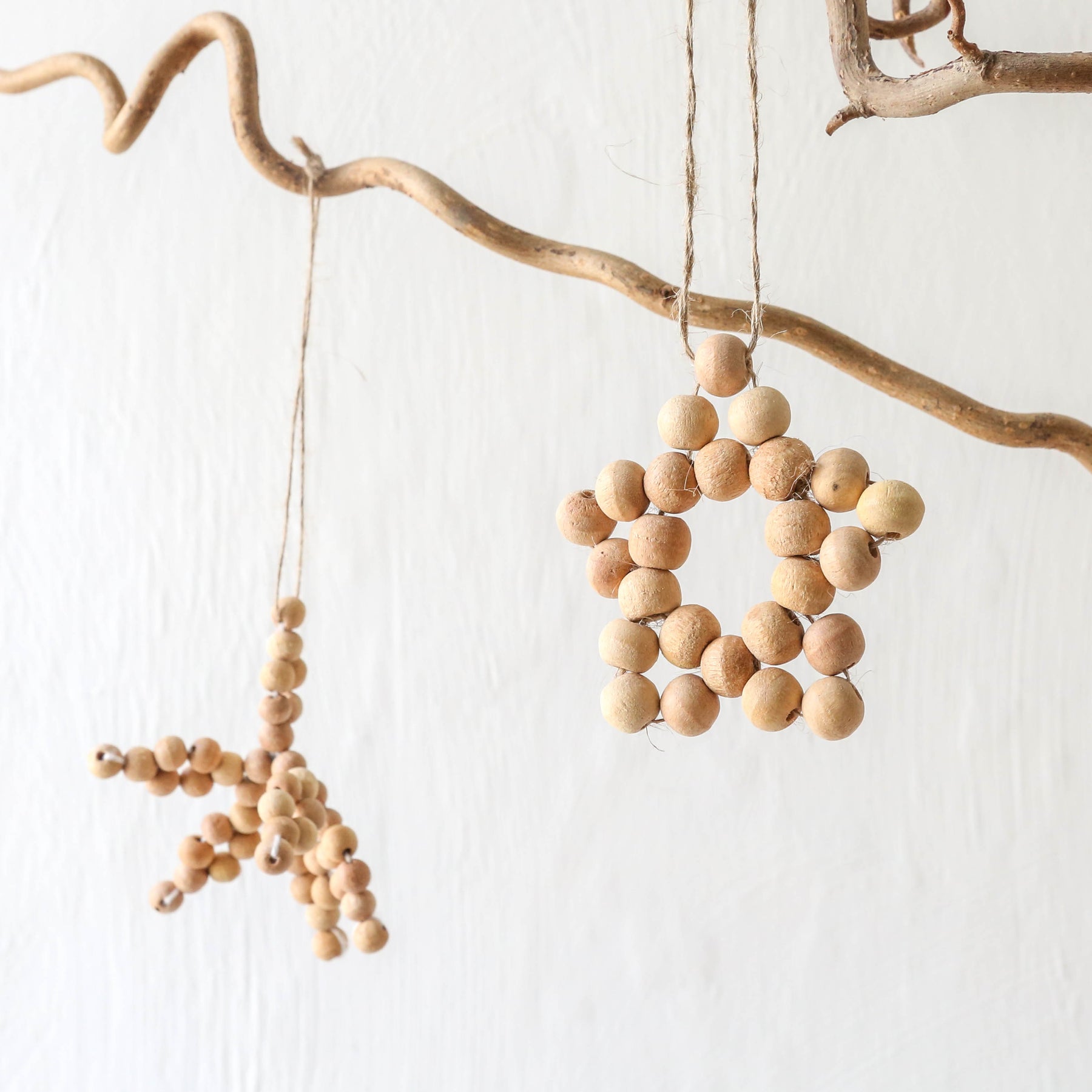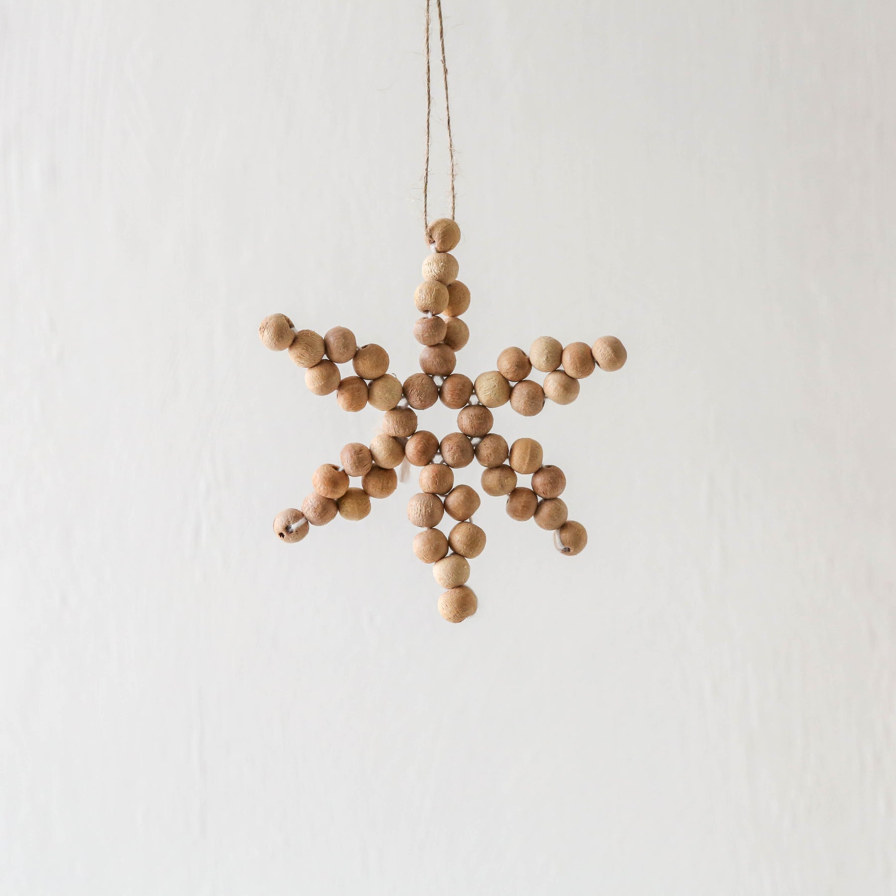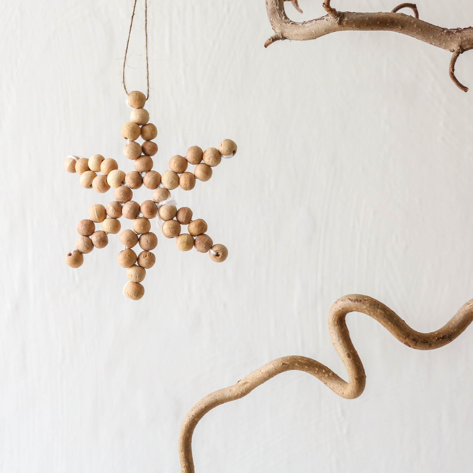 A beautiful hand-crafted natural wooden beaded decoration in the shape of a star.