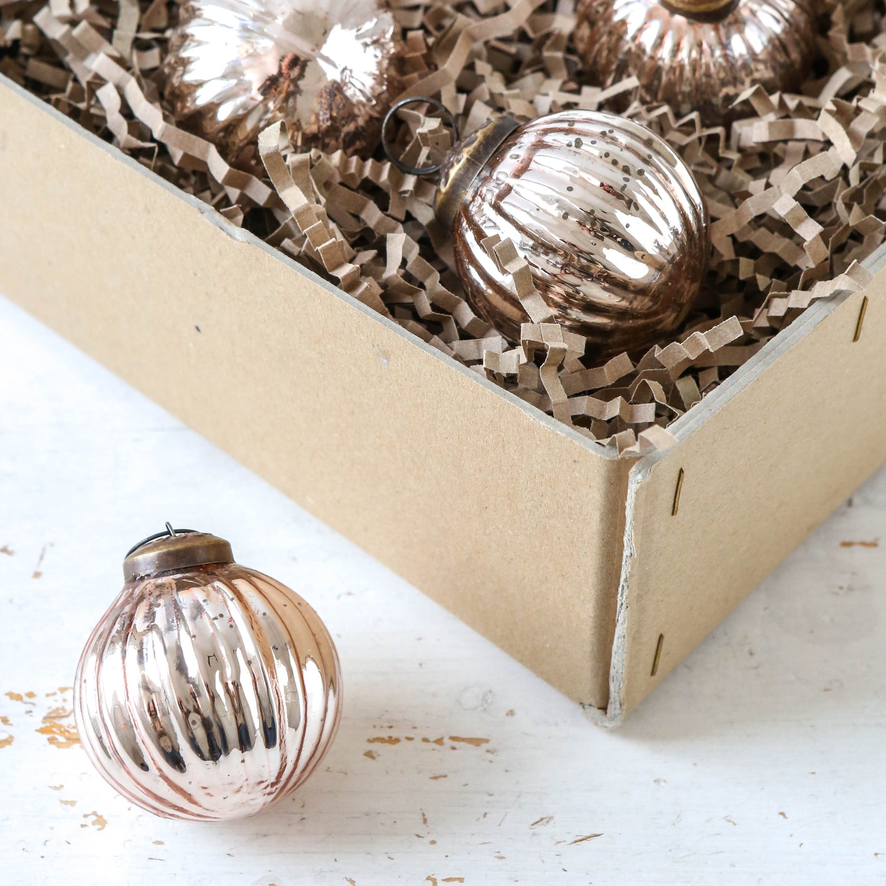 A hand-blown ribbed bauble measuring approximately  5cm in diameter.