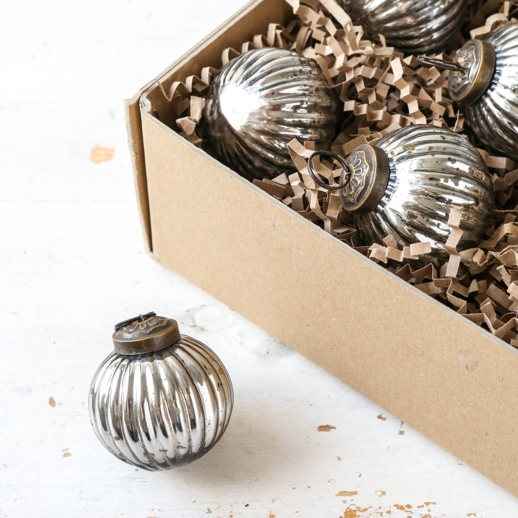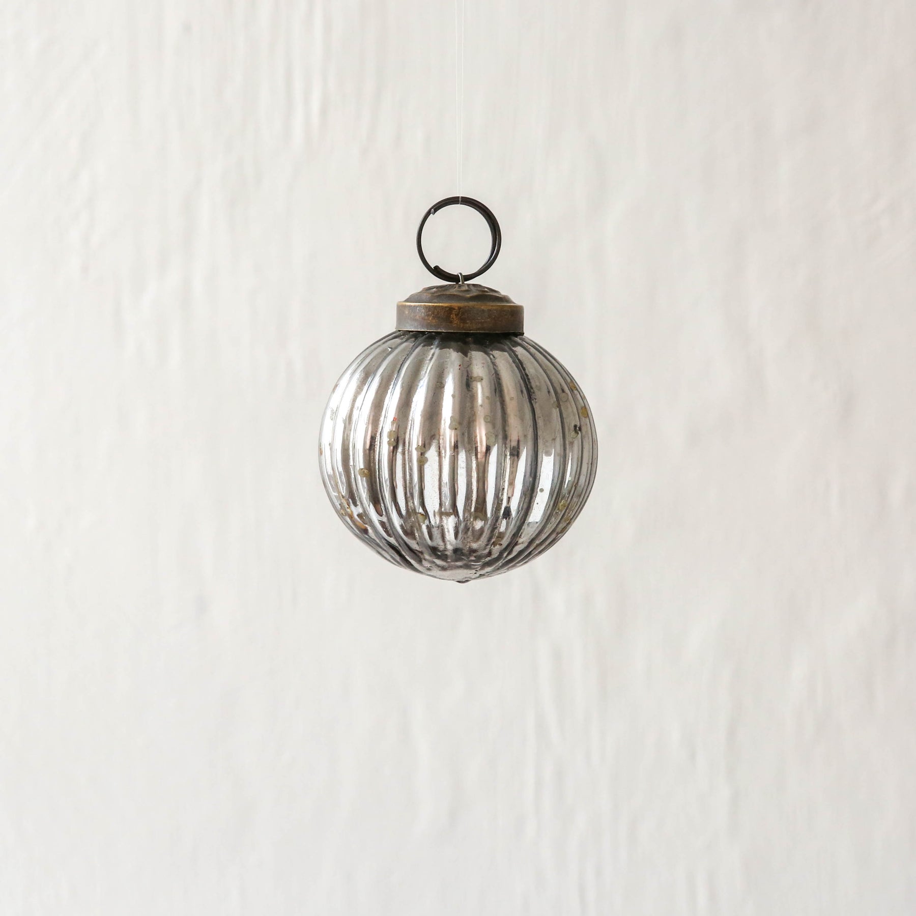 A hand-blown ribbed bauble measuring approximately  5cm in diameter.