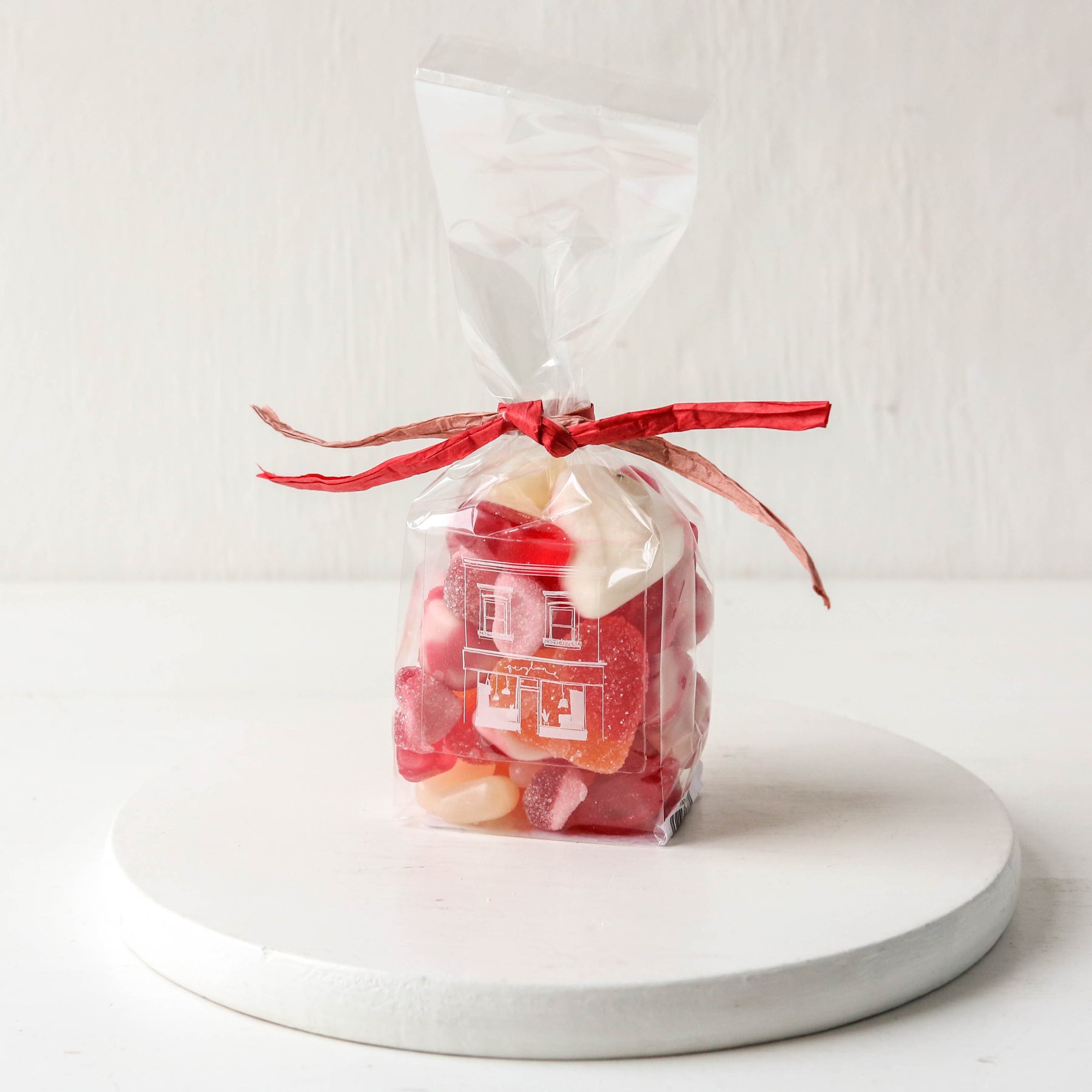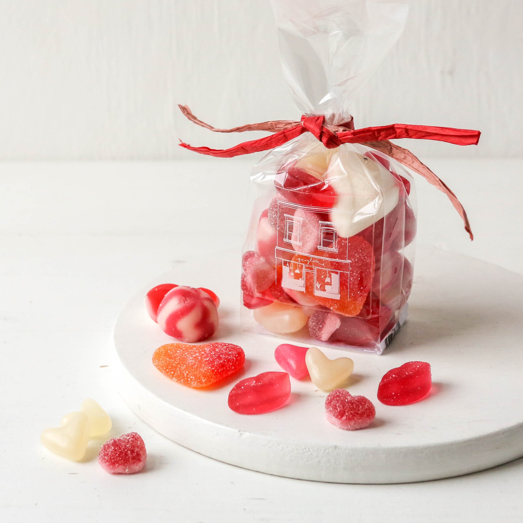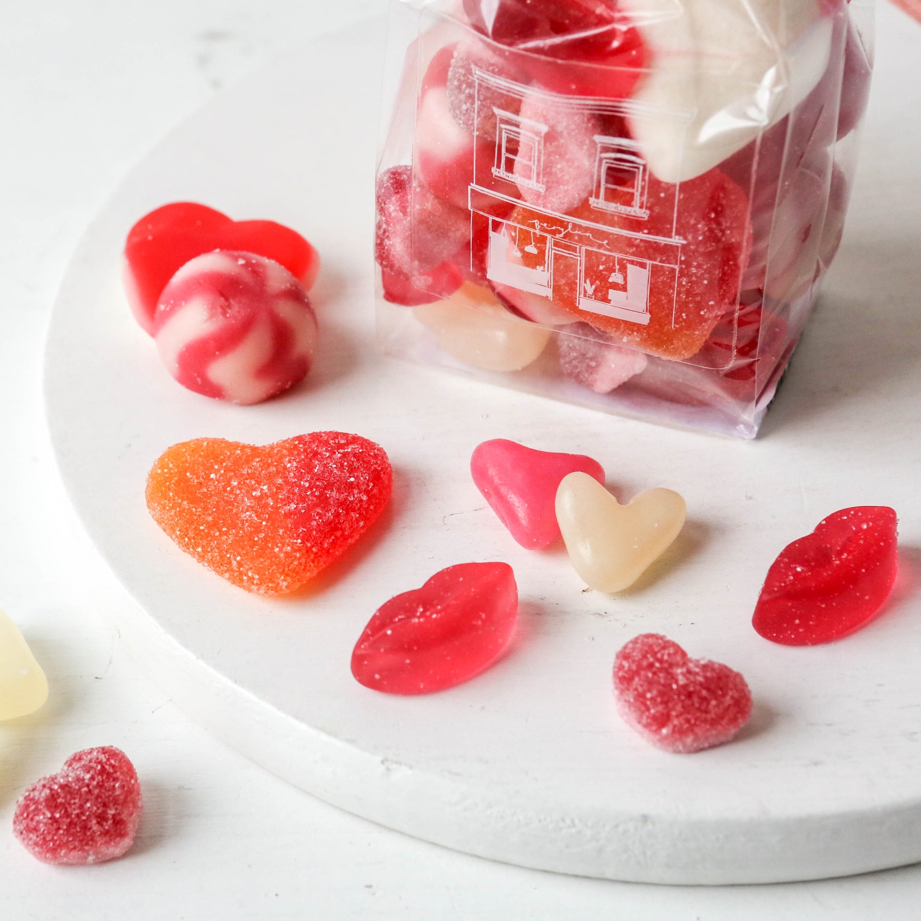 Gummy Hearts: Glucose Syrup, Sugar, Water, Beef Gelatine (Halal), Modified Potato Starch, Acids (E270), Flavourings, Colours (E163, E129, E160)