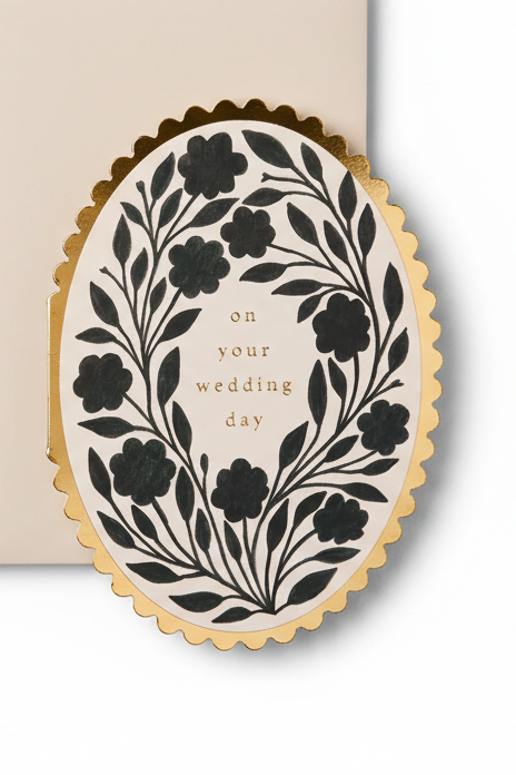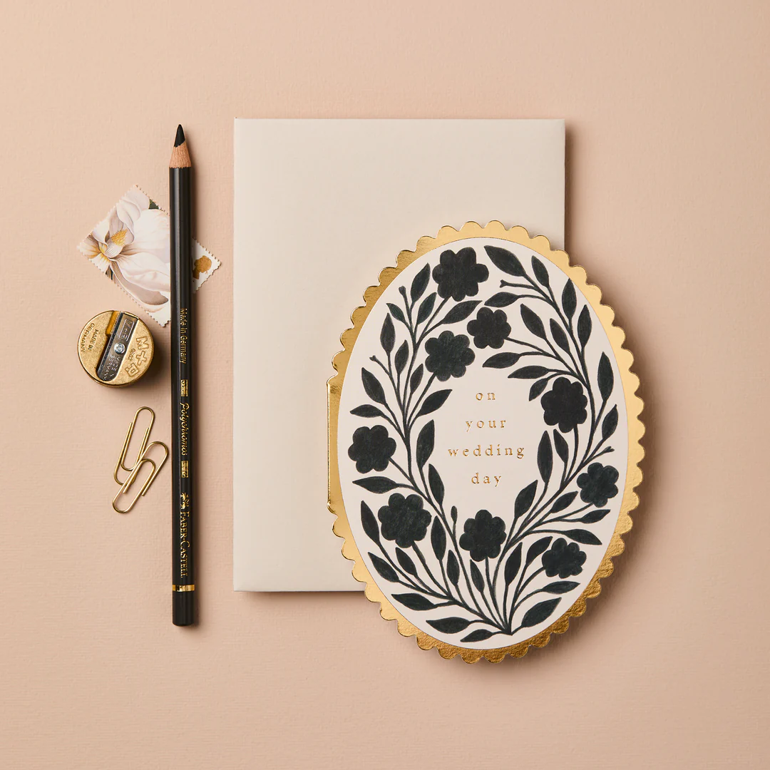 A beautiful oval card with golden scallop edging and an ink floral print. The floral design has a painterly quality as it's taken from an original gouache painting, and the gold foil text in the centre of the card reads 'On Your Wedding Day'. Paired with a complementary pale grey envelope.