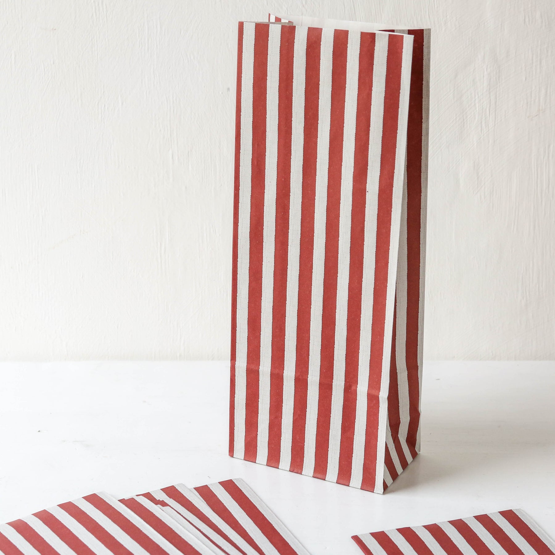 Pretty block bottom gift bags in rustic red candy stripe design. Perfect for awkward shaped gifts and baked goods.