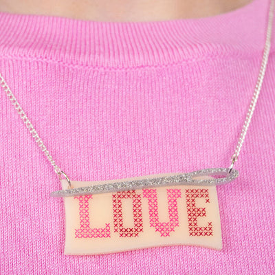 'Jewellery for crafters? You can count on our Love Cross Stitch Necklace! Etched and hand-inked to resemble a cross-stitched ode to all things romantic: catch everyone’s eye on your next trip to the Haberdashery in this wearable necklace.'