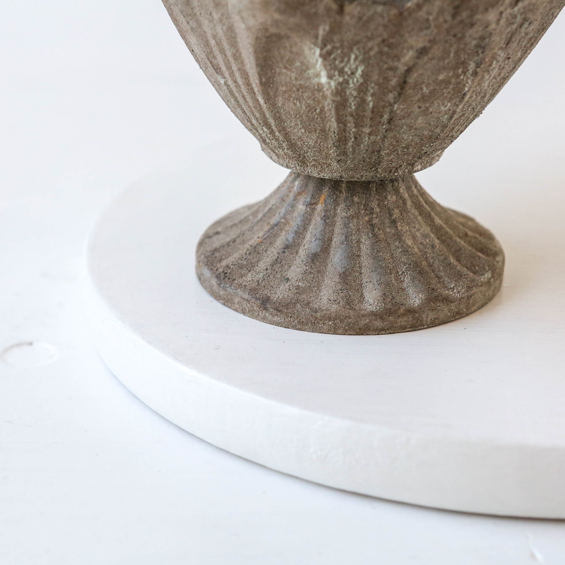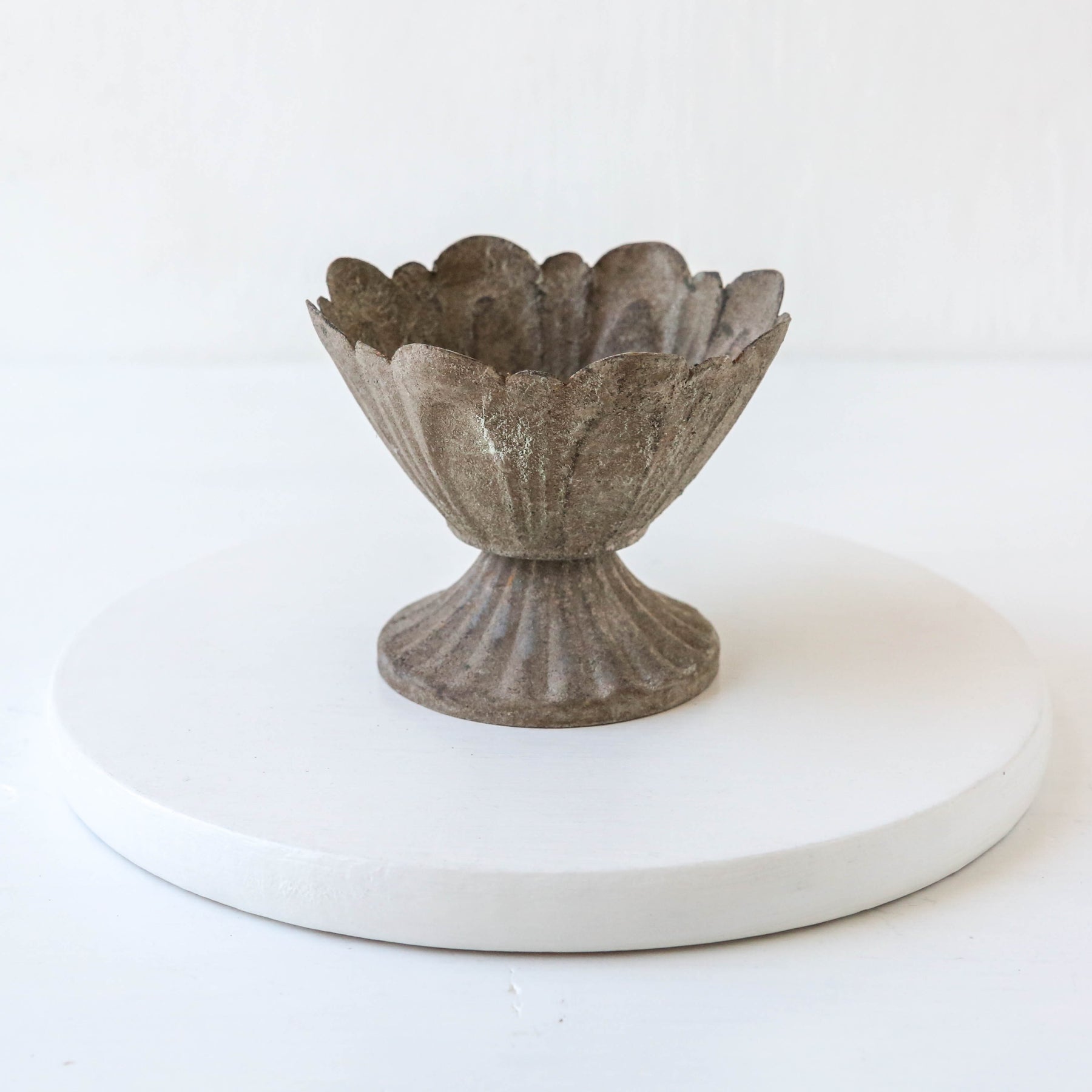 Weathered metal urn, perfect for spring bulbs or succulents.