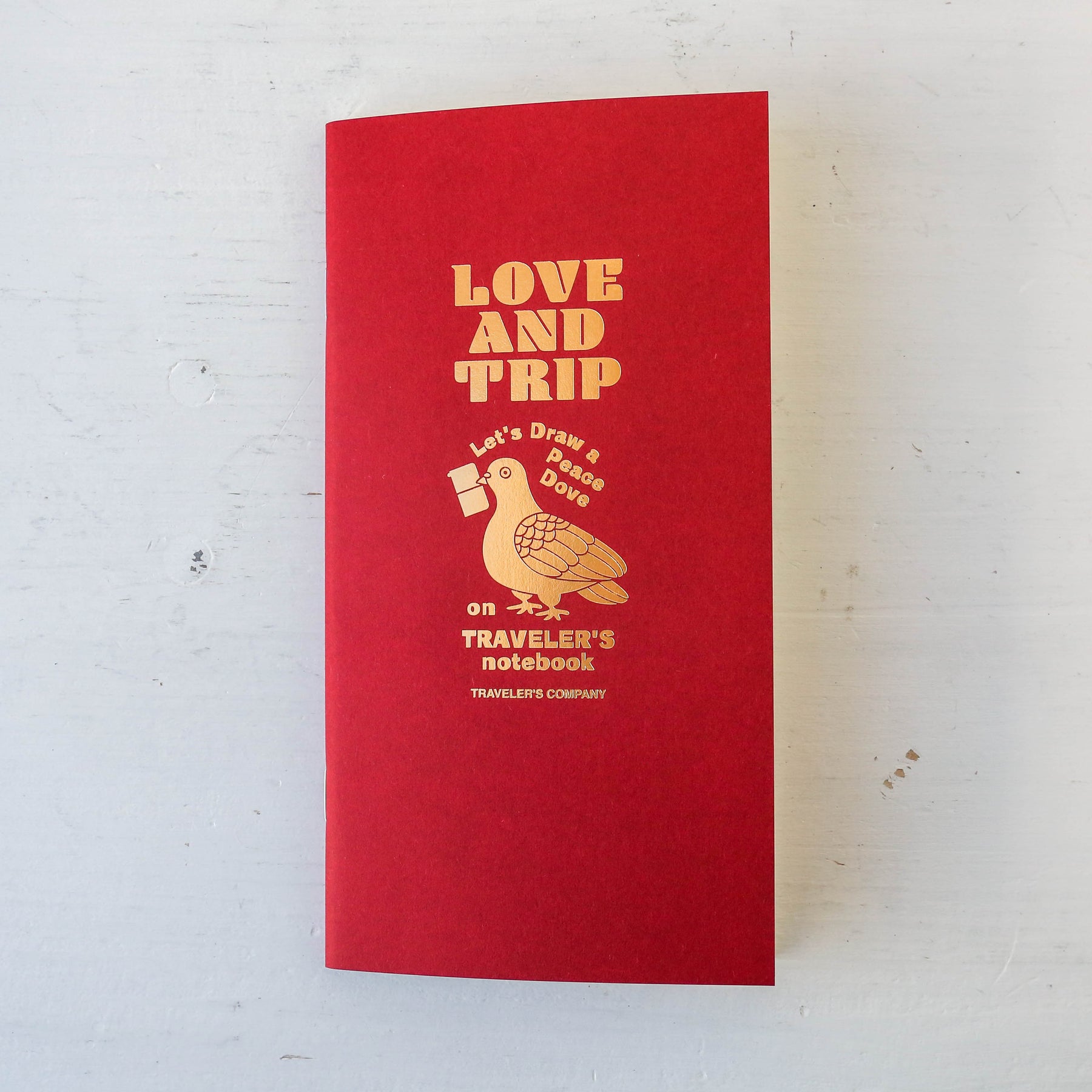 The TRAVELER'S notebook LOVE AND TRIP refill features MD PAPER Cream for smooth writing and a letterpress-printed message card. Encouraging love over hate, the notebook inspires travellers to share their passions, fostering warm connections worldwide. LOVE AND TRIP aims to be a catalyst for these meaningful encounters.