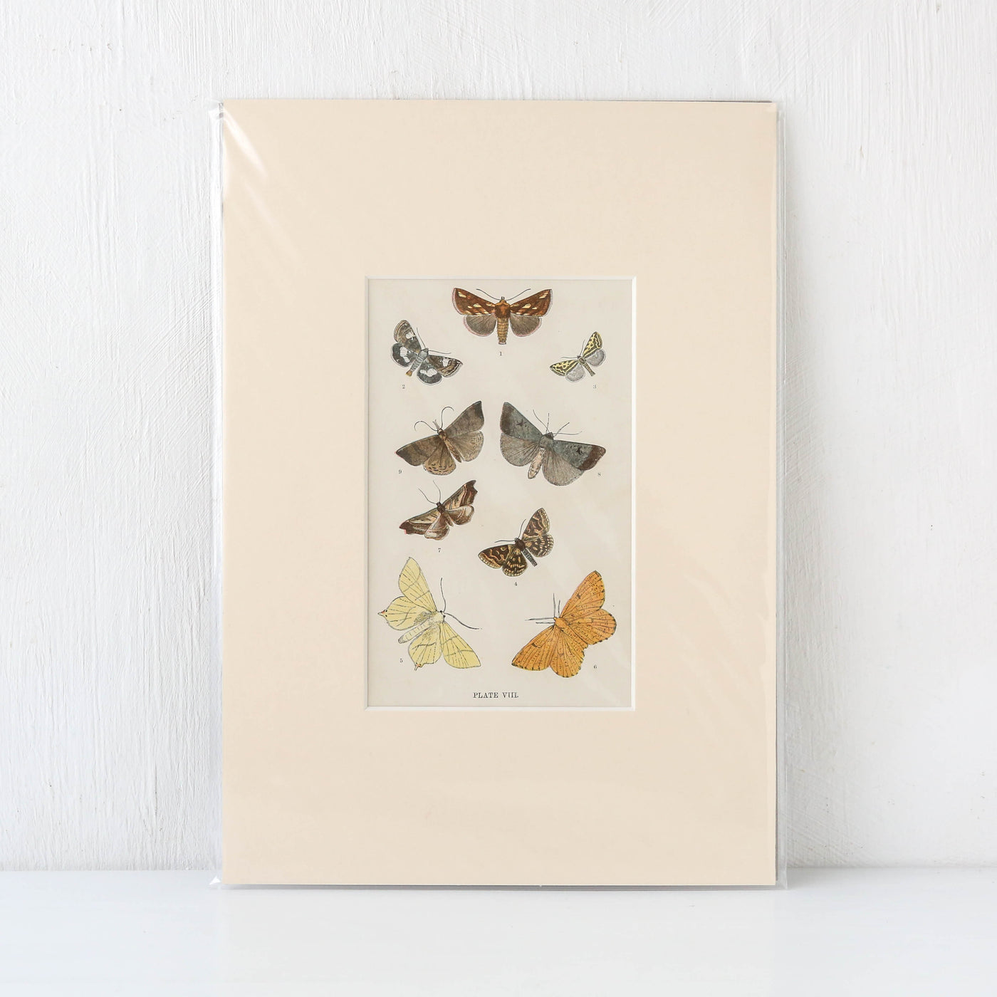 A beautifully finished vintage book plate, featuring intricate moth illustrations. We have seated it securely in an A4 Ivory mount, ready to be framed as you see fit.
